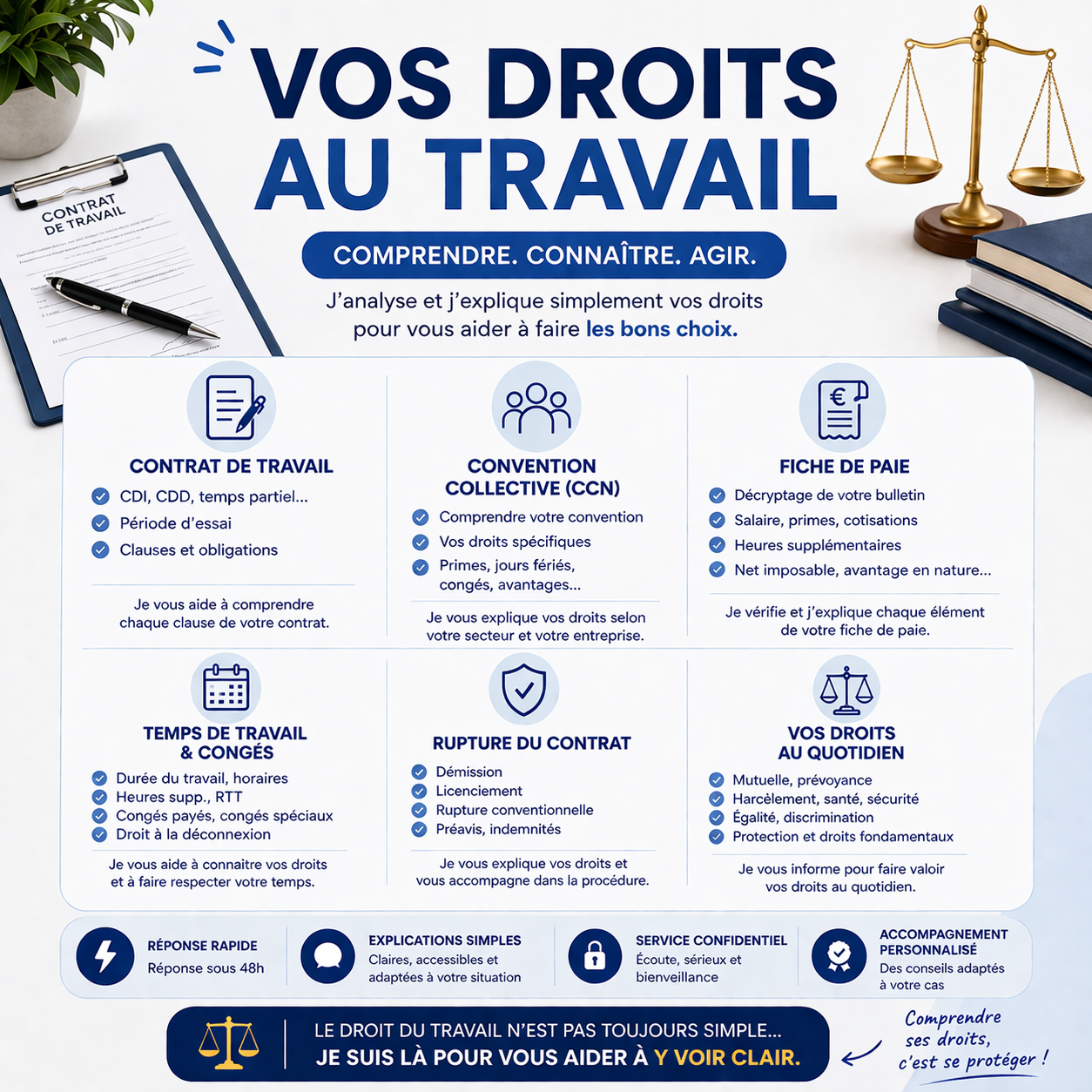 ✔ Droit du travail (bases solides) ✔ Analyse de contrat de travail ✔ Compréhension de convention collective ✔ Lecture de fiche de paie ✔ Explications simples et accessibles