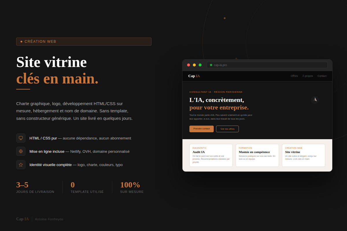 Accompagnement de TPE, PME et indépendants sur l'intégration de l'IA dans leurs process. Création du site cap-ia.pro de A à Z : charte graphique, développement HTML/CSS, mise en ligne. -