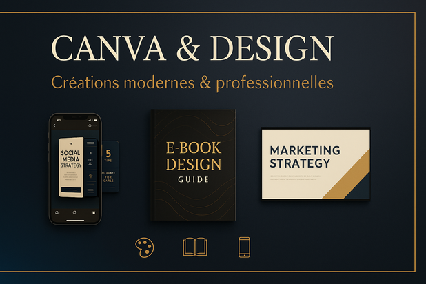 🔹 Design & Canva – Conception de visuels modernes et impactants (carrousels, présentations, e-books, templates prêts à l’emploi). Idéal pour booster votre image et vos réseaux sociaux.