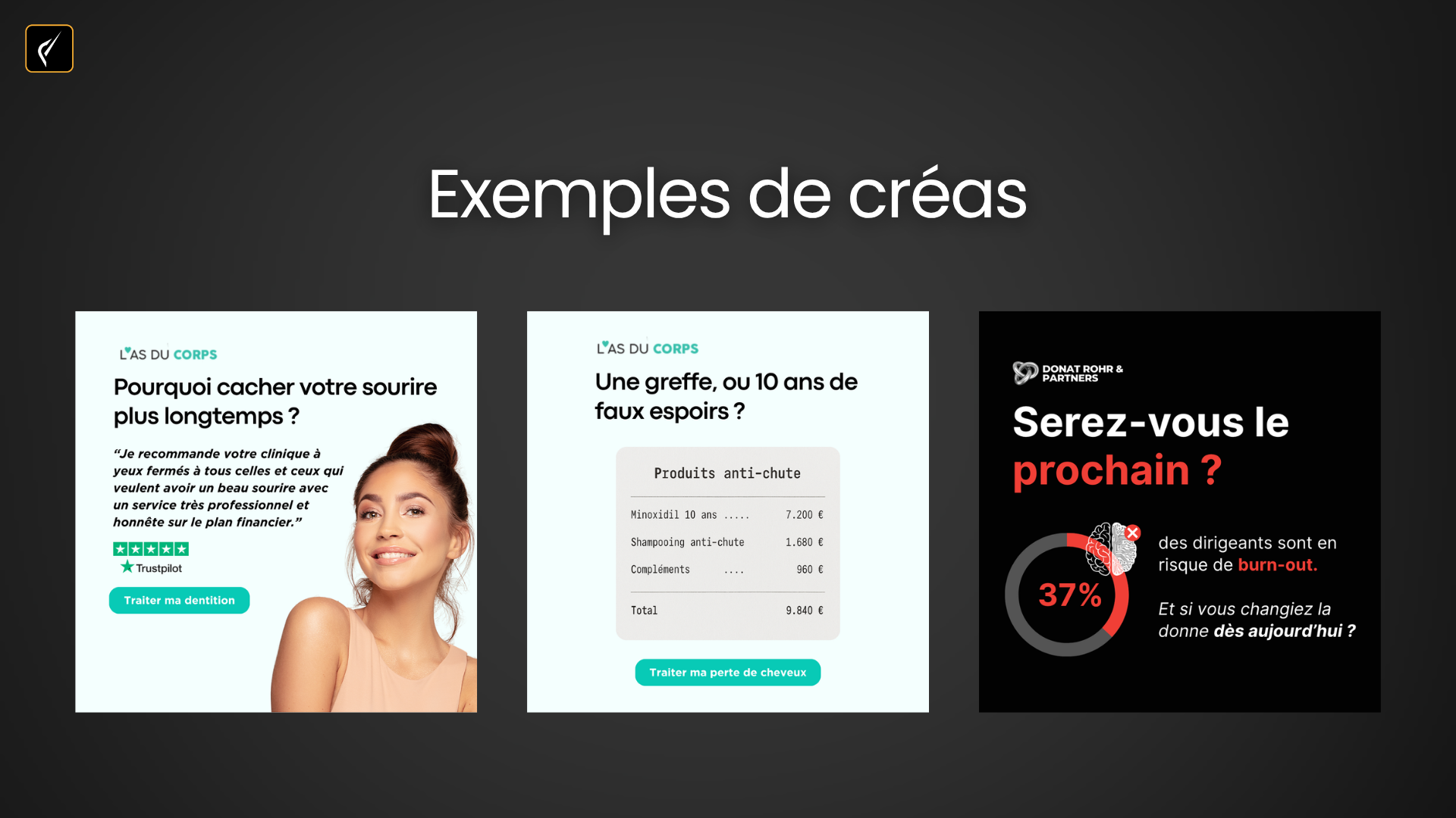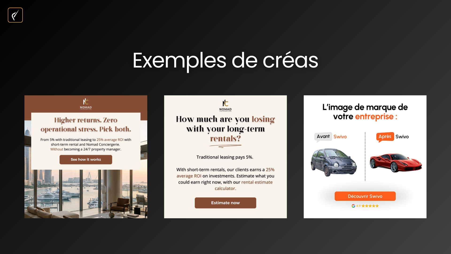 Production de Créative Ads : ✅ Stratégie créative Meta Ads (ou autre régie Social Ads) ✅ Testing pour trouver les créas qui performent ✅ Production de publicités statiques ✅ Production de publicités vidéo avec une combinaison des dernières IA (Veo3, Higgsfield...)