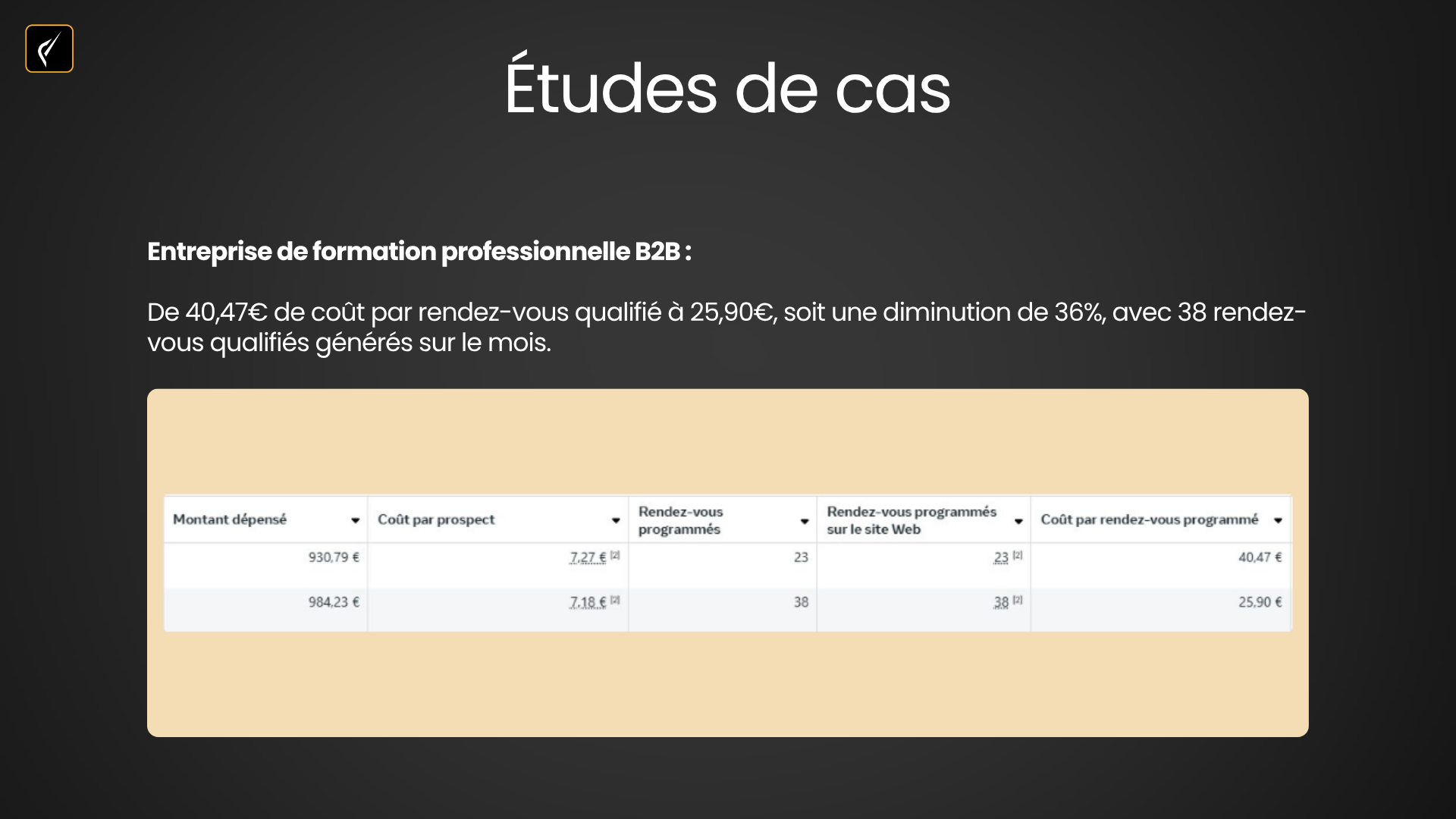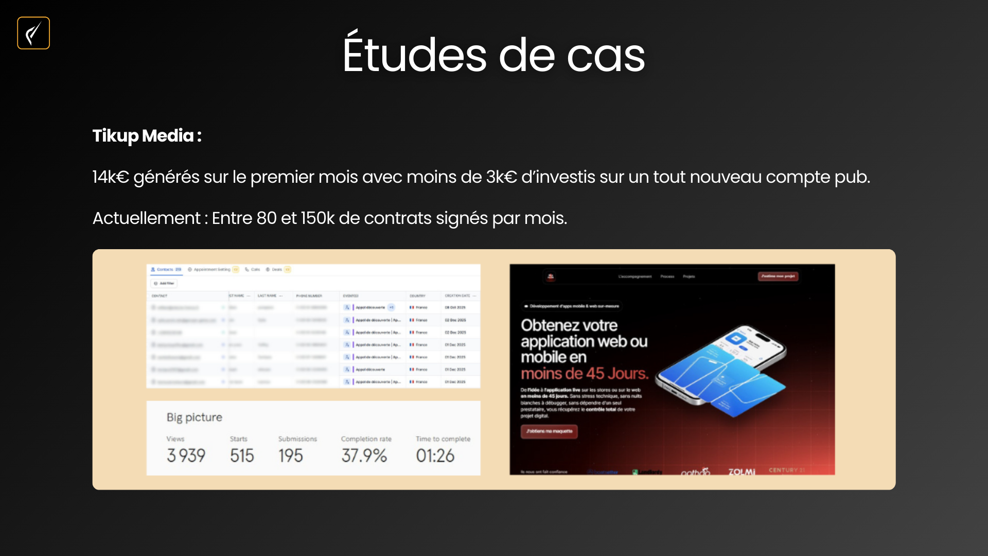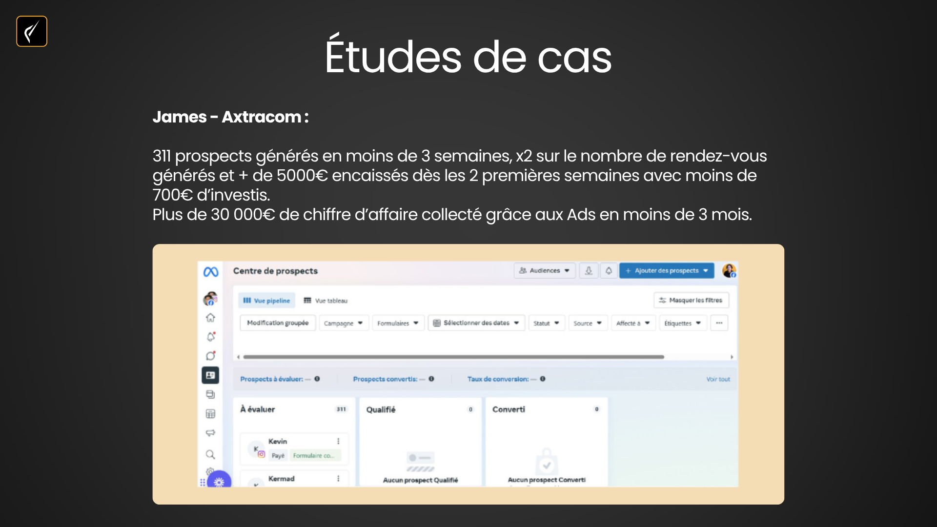 + 20 entreprises accompagnées en publicité J'aide les entreprises en croissance à générer plus de ventes grâce à la publicité en ligne sur Meta Ads et autres régies (Google, LinkedIn Ads, TikTok Ads). -
