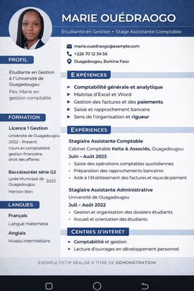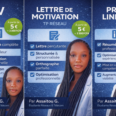Bonjour 👋, je m'appelle Assaitou Guengané, étudiante en Licence 1 Réseaux et Télécommunications à Ouagadougou. Je propose des services professionnels pour vous aider à : ✔ Créer ou améliorer votre CV ✔ Rédiger une lettre de motivation impactante ✔ Optimiser votre profil LinkedIn pour attirer les recruteurs Je m'assure que vos documents soient clairs, bien structurés et adaptés au poste que vous visez. Mon objectif : vous aider à présenter la meilleure version de vous-même pour maximiser vos chances de réussite. 🎯 Travail rapide, soigné et personnalisé 📩 Contactez-moi avant de commander pour discuter de votre besoin