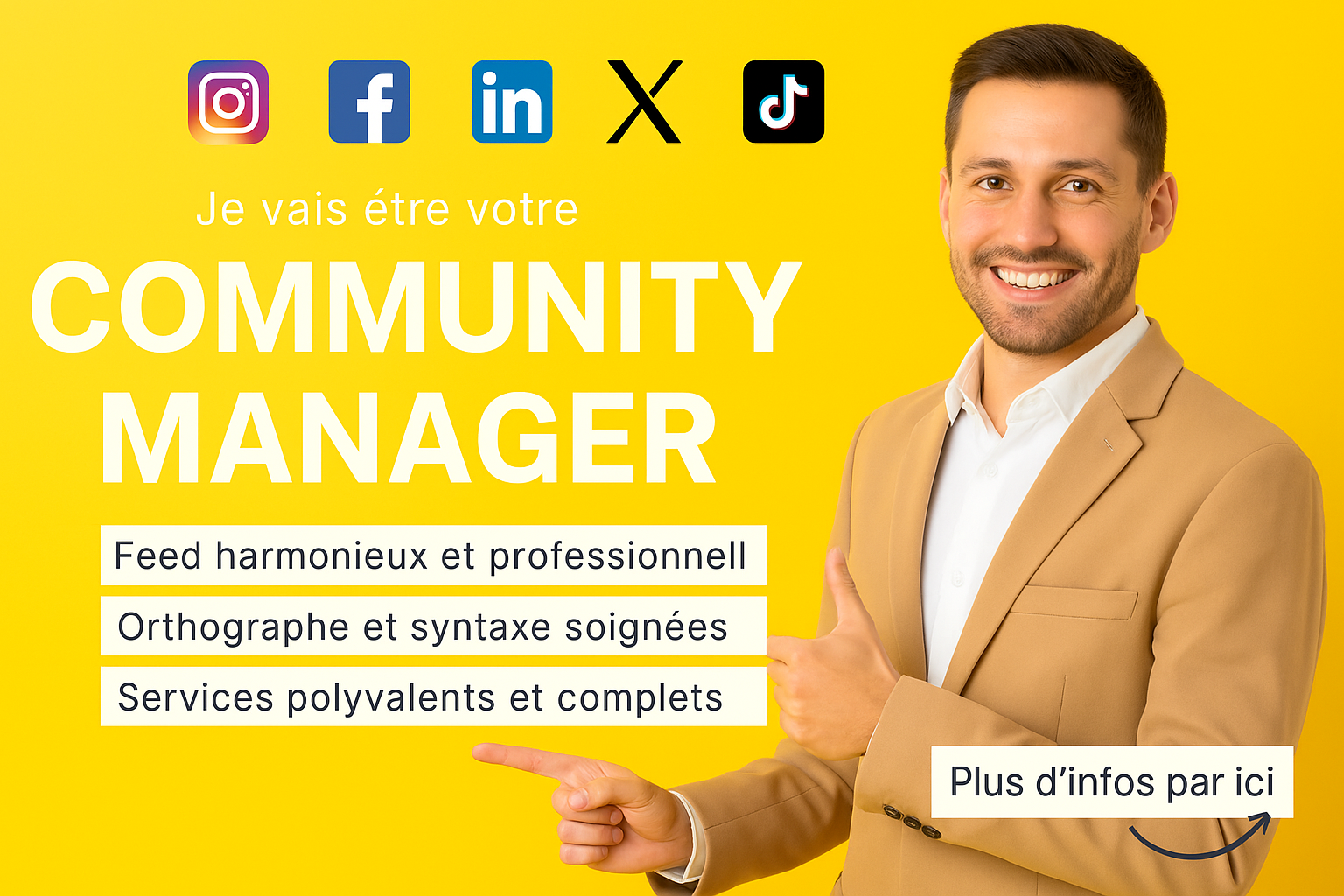 Je vous accompagne dans la gestion complète de votre communication digitale avec des services polyvalents, personnalisés et pensés pour vous faire gagner du temps, professionnaliser votre image et booster votre visibilité en ligne.