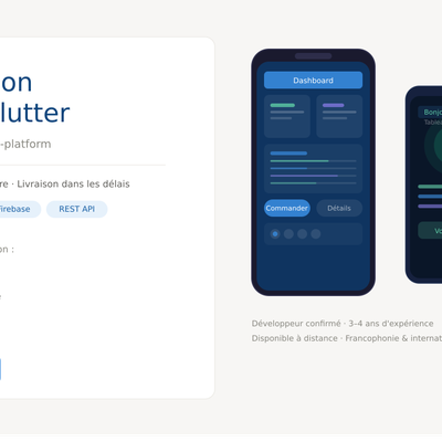 Mon stack principal : Flutter/Dart pour le mobile cross-platform, React pour les interfaces web modernes, et Node.js / Django côté serveur. Je travaille avec des bases de données relationnelles et NoSQL, et j'ai l'habitude de livrer des projets de A à Z.