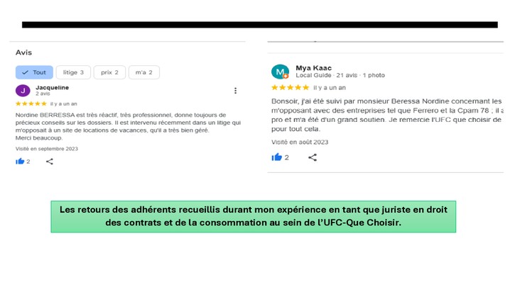 Gestion intégrale de dossiers contentieux et précontentieux (consommation, immobilier, assurance, banque). Rédaction de plus de 150 actes juridiques (mises en demeure, signalements, relances, correspondances adhérents). Résolution amiable de litiges