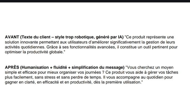 J’aide les entrepreneurs, créateurs de contenu et entreprises à obtenir des textes propres, naturels, fluides et percutants. Que vous vouliez améliorer un texte, corriger les fautes, reformuler pour plus de clarté ou rendre un contenu IA plus humain, je m’occupe de tout.