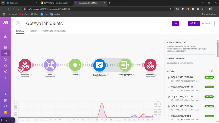 Vérification d'Agenda Asynchrone : En une fraction de seconde, Make interroge le calendrier du CRM (GoHighLevel) pour valider la réelle disponibilité du conseiller humain à l'heure réclamée.