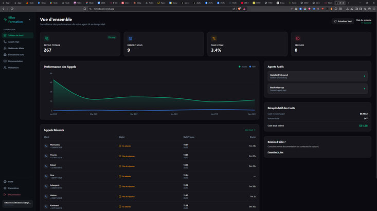 Une application Next.js ultra-réactive hébergée sur l'infrastructure Vercel forçant une fluidité totale des données. Ce tableau de bord analytique permet aux décideurs humains de visualiser instantanément le retour sur investissement de leur standard vocal IA :