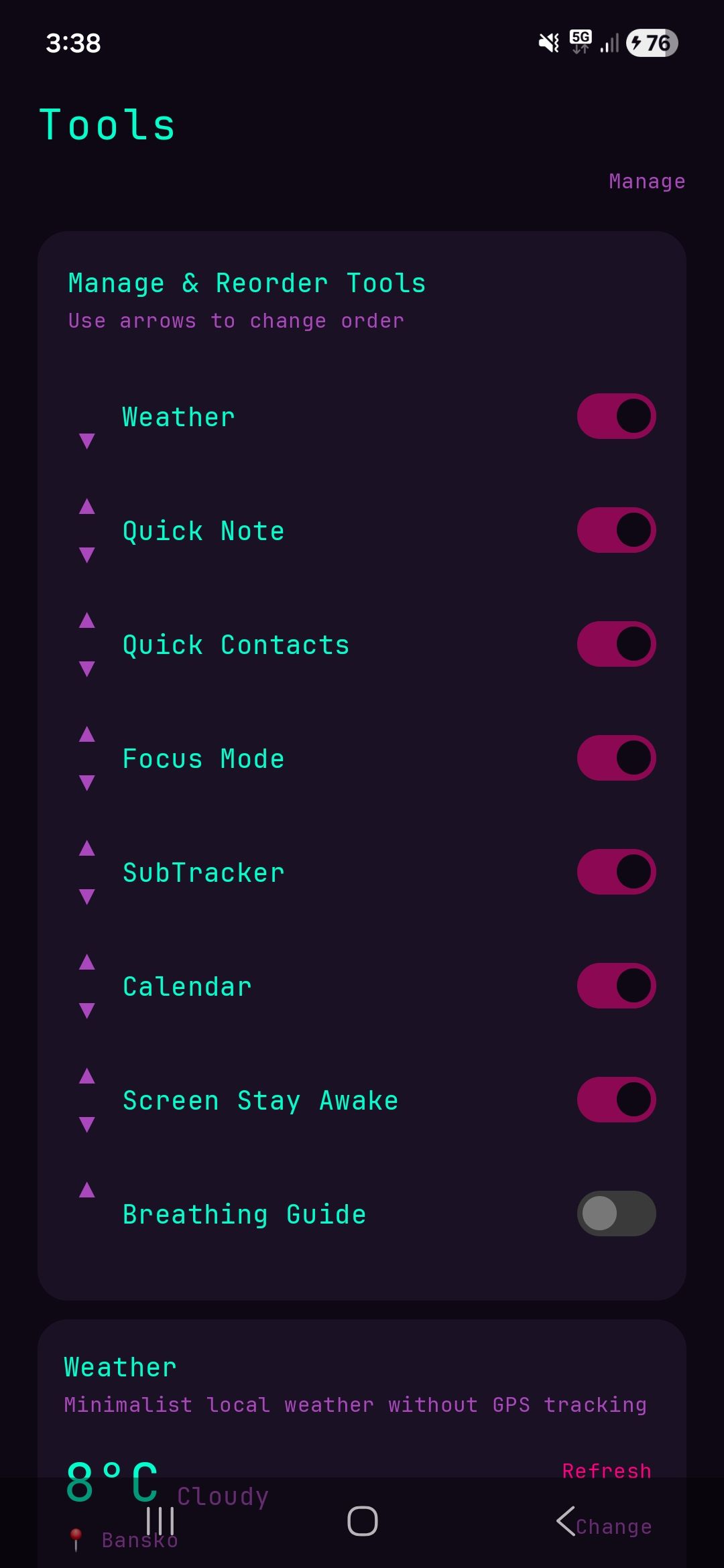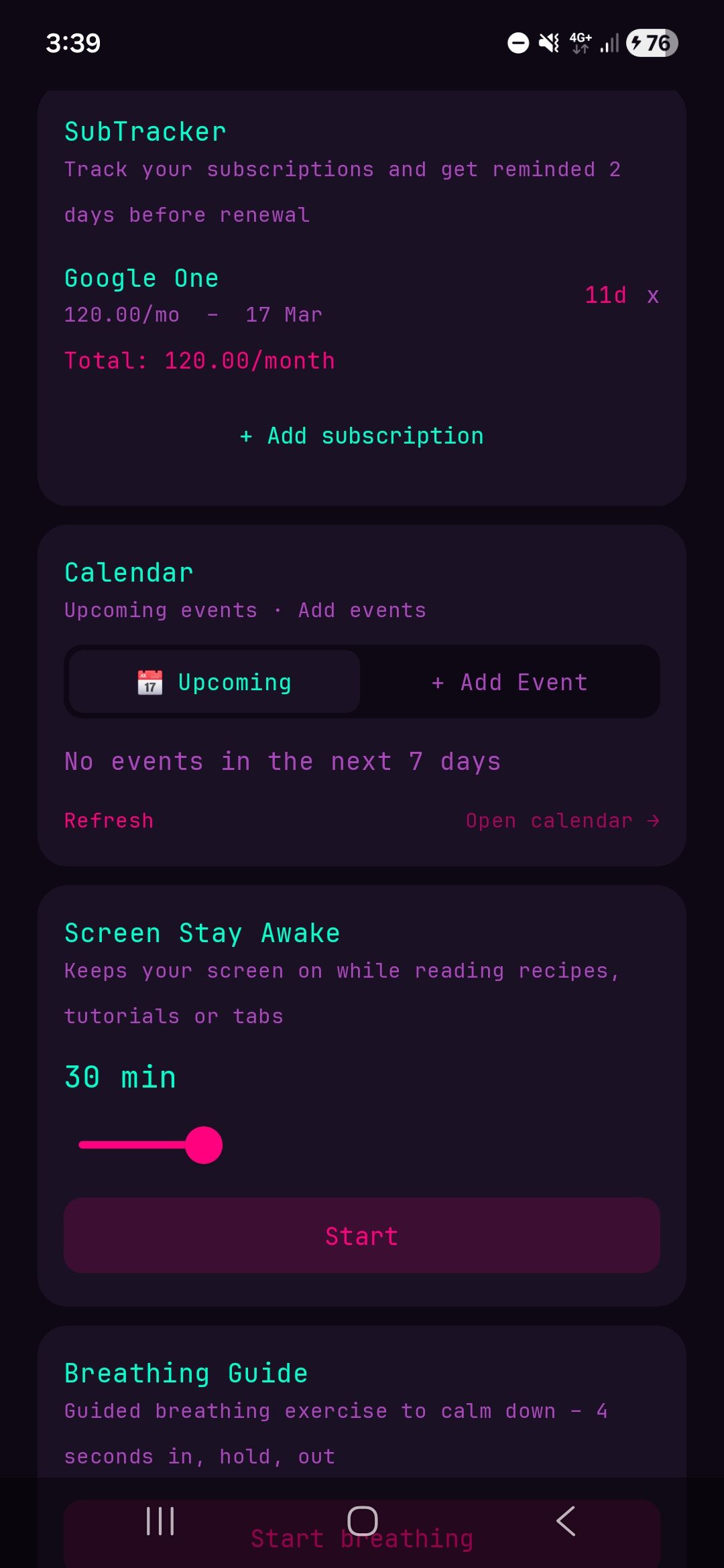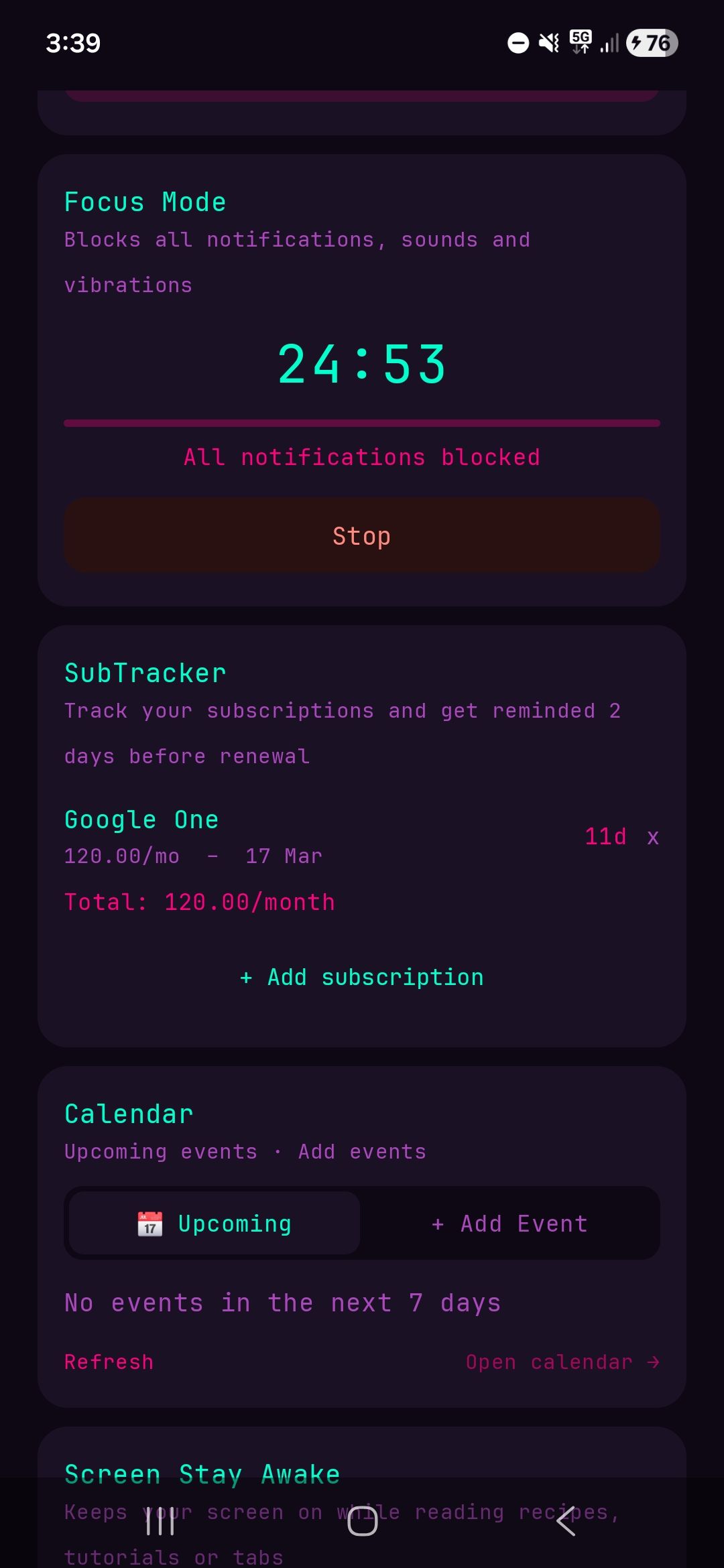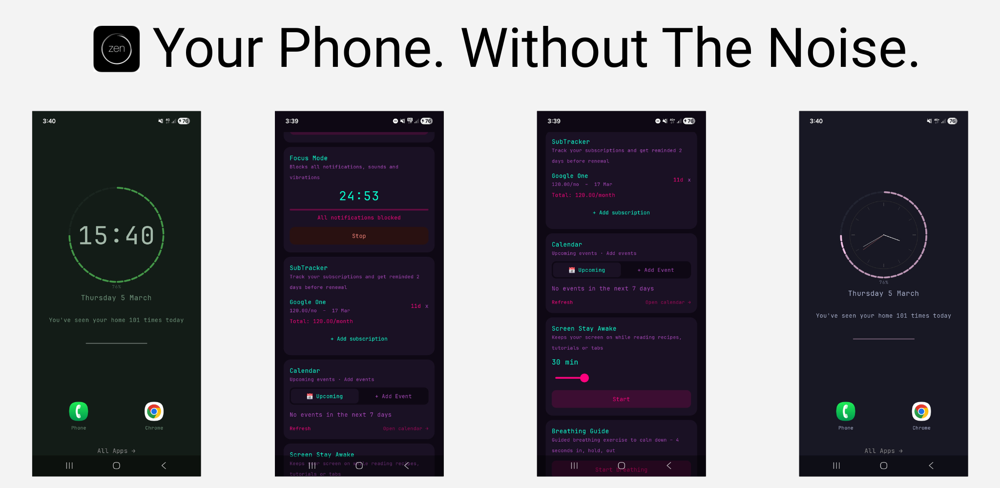 Applications Android : Launchers personnalisés, thèmes et typos variés, outils internes comme trackers, calendrier, focus mode et guides de respiration.