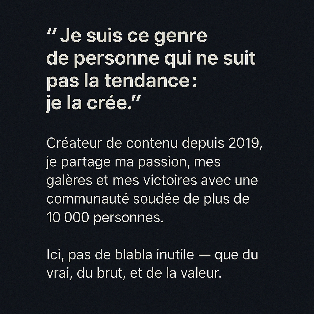 Je m’adapte à ton style et à ta vibe, que tu veuilles une bio sérieuse ou fun, je suis là pour te proposer une solution qui te correspond vraiment.