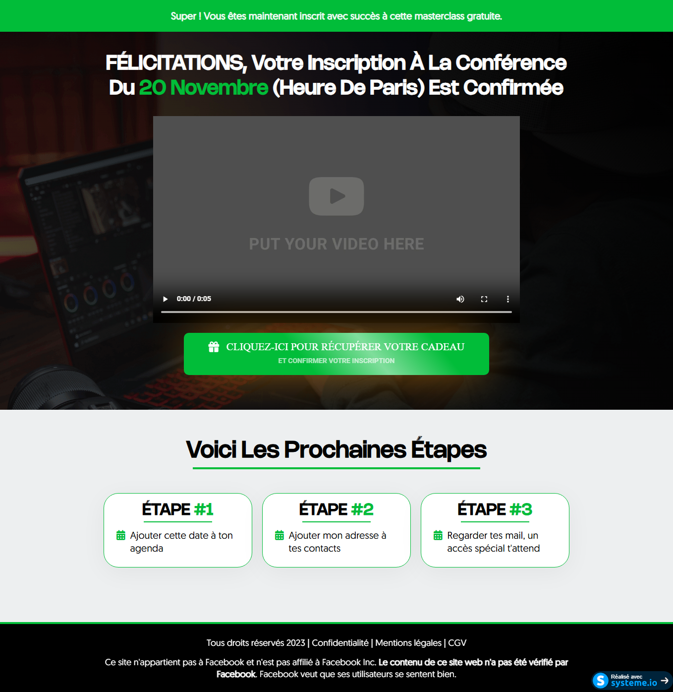 🚀 MON OBJECTIF Créer pour vous une stratégie marketing rentable, basée sur un tunnel webinaire clair, automatisé et calibré pour convertir. De l’inscription à la séquence email post-webinaire, chaque étape est pensée pour transformer vos prospects en clients engagés.