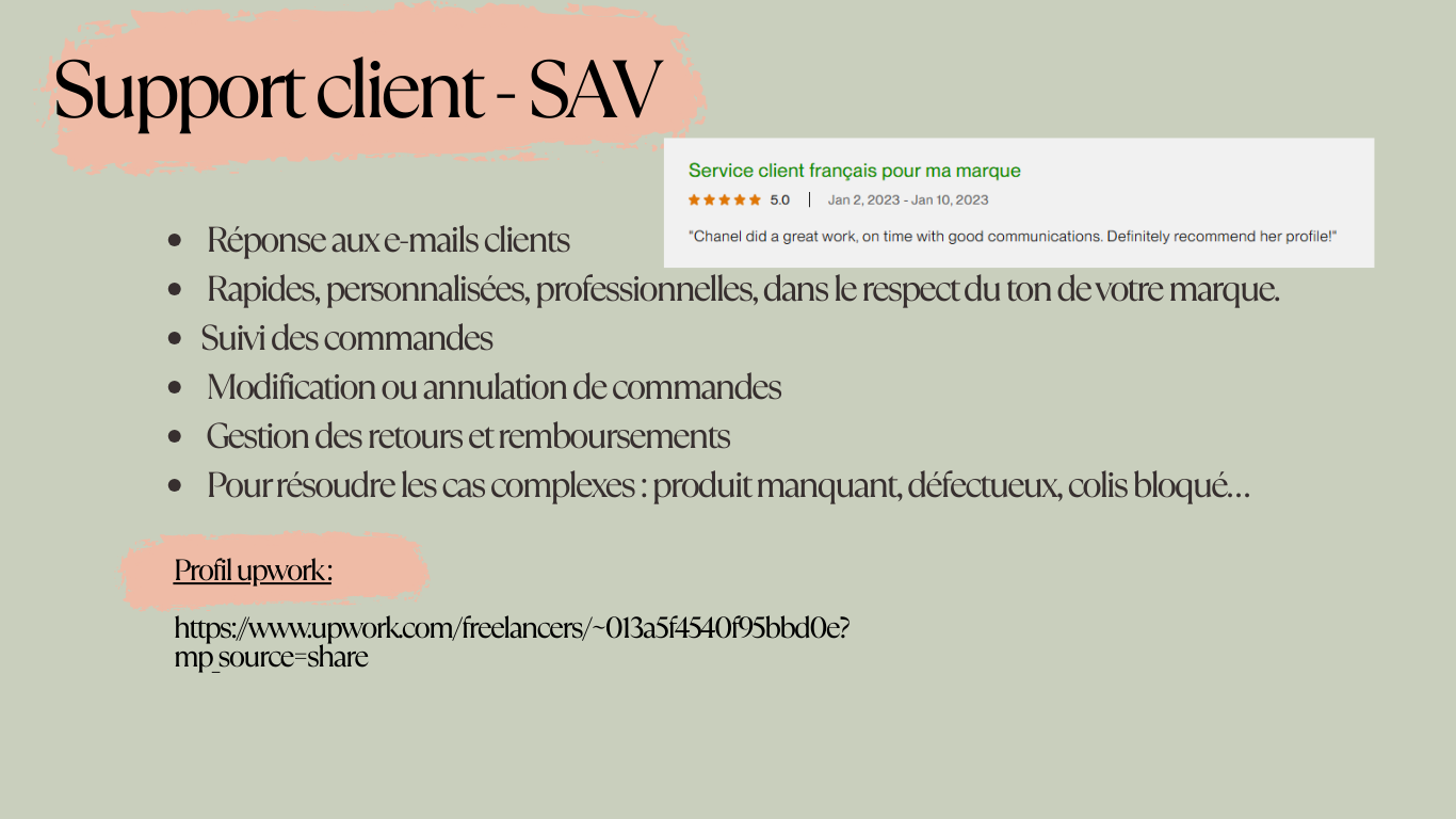 • Réponses rapides et personnalisées aux e-mails • Suivi et modification des commandes • Gestion des retours et des réclamations • Communication claire avec vos fournisseurs