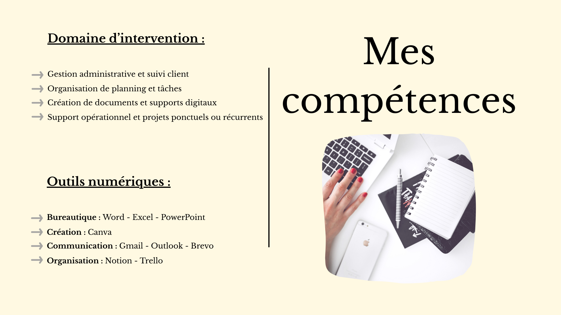 Assistante virtuelle, j’accompagne les entreprises et indépendant·es dans l’organisation, la gestion administrative et la structuration de leurs processus. J’interviens à distance pour apporter un soutien opérationnel et organisationnel. -