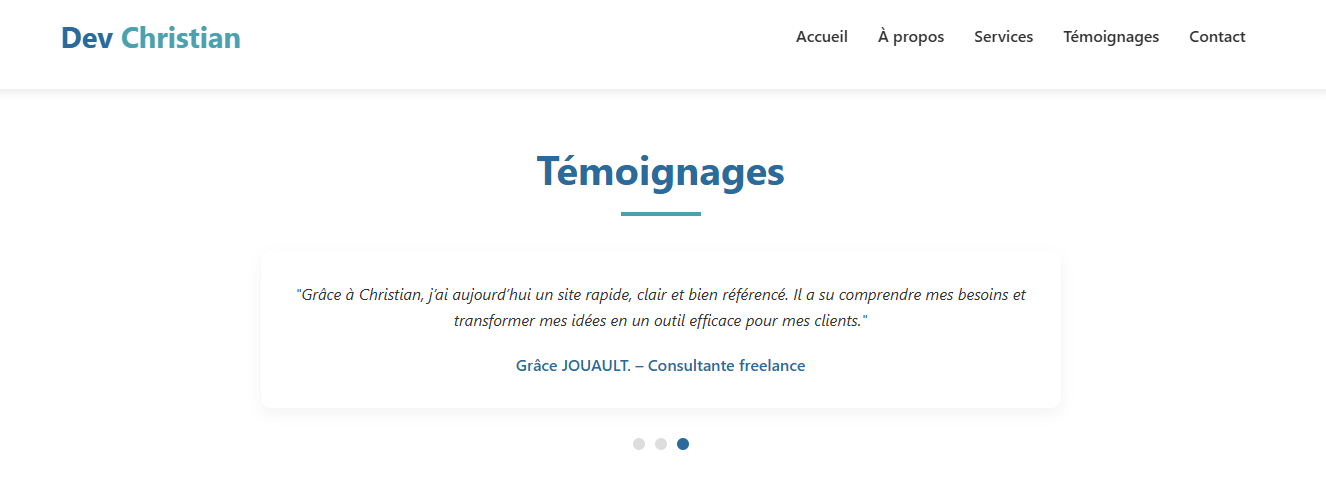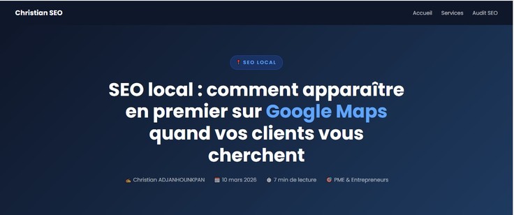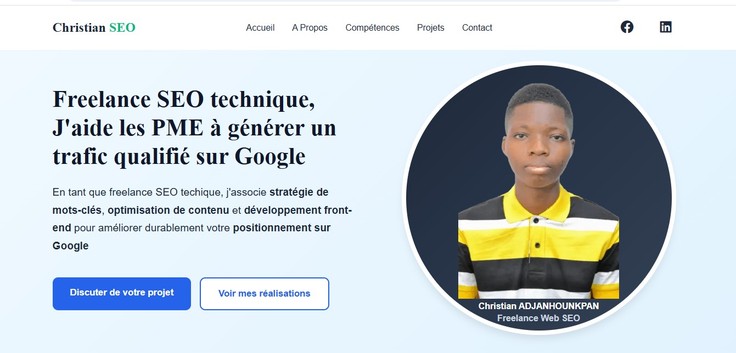 Vous souhaitez améliorer votre visibilité sur Google et attirer plus de clients ? Je suis Christian ADJANHOUNKPAN, spécialiste SEO technique et développeur front-end freelance. J'aide les entrepreneurs et PME francophones à améliorer leur référencement naturel grâce à des stratégies concrètes et durables. Mon expertise SEO : Audit SEO technique complet, optimisation Google Business Profile, SEO local, données structurées, Core Web Vitals, Google Search Console et rédaction de contenus optimisés. Mon expertise technique : HTML5, CSS3, JavaScript: ce qui me permet de corriger directement les problèmes techniques dans le code, sans intermédiaire. Pourquoi me choisir ? Avant de vous proposer mes services, j'ai appliqué mes méthodes SEO sur mon propre portfolio. Résultat : SEO : 100/100 Performance : 96/100 Bonnes pratiques : 100/100 Accessibilité : 95/100