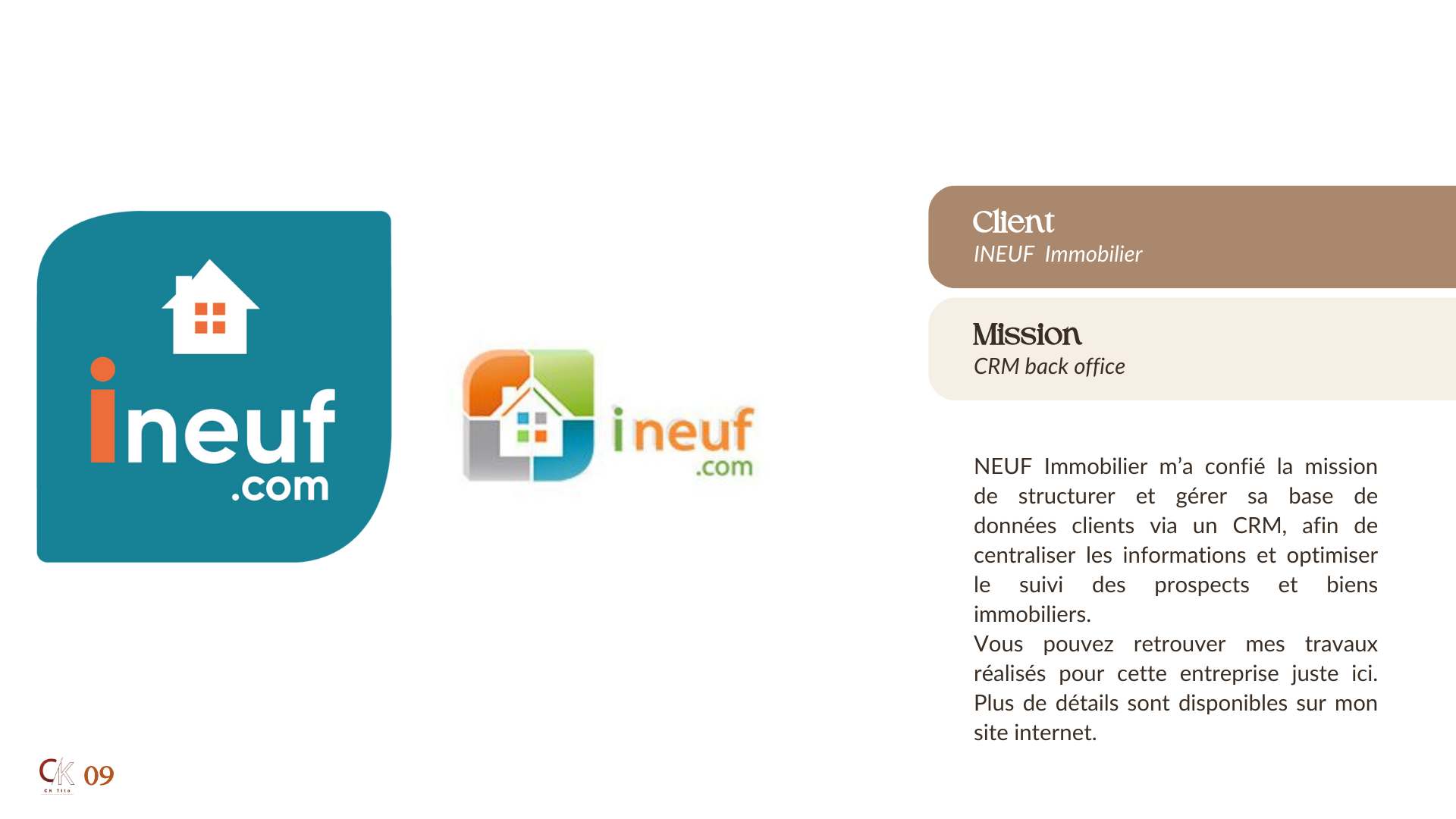 Responsable CRM chez INEUF Immobilier : gestion de la base de données clients et optimisation du suivi des prospects afin d'améliorer les relations clients et les performances commerciales.