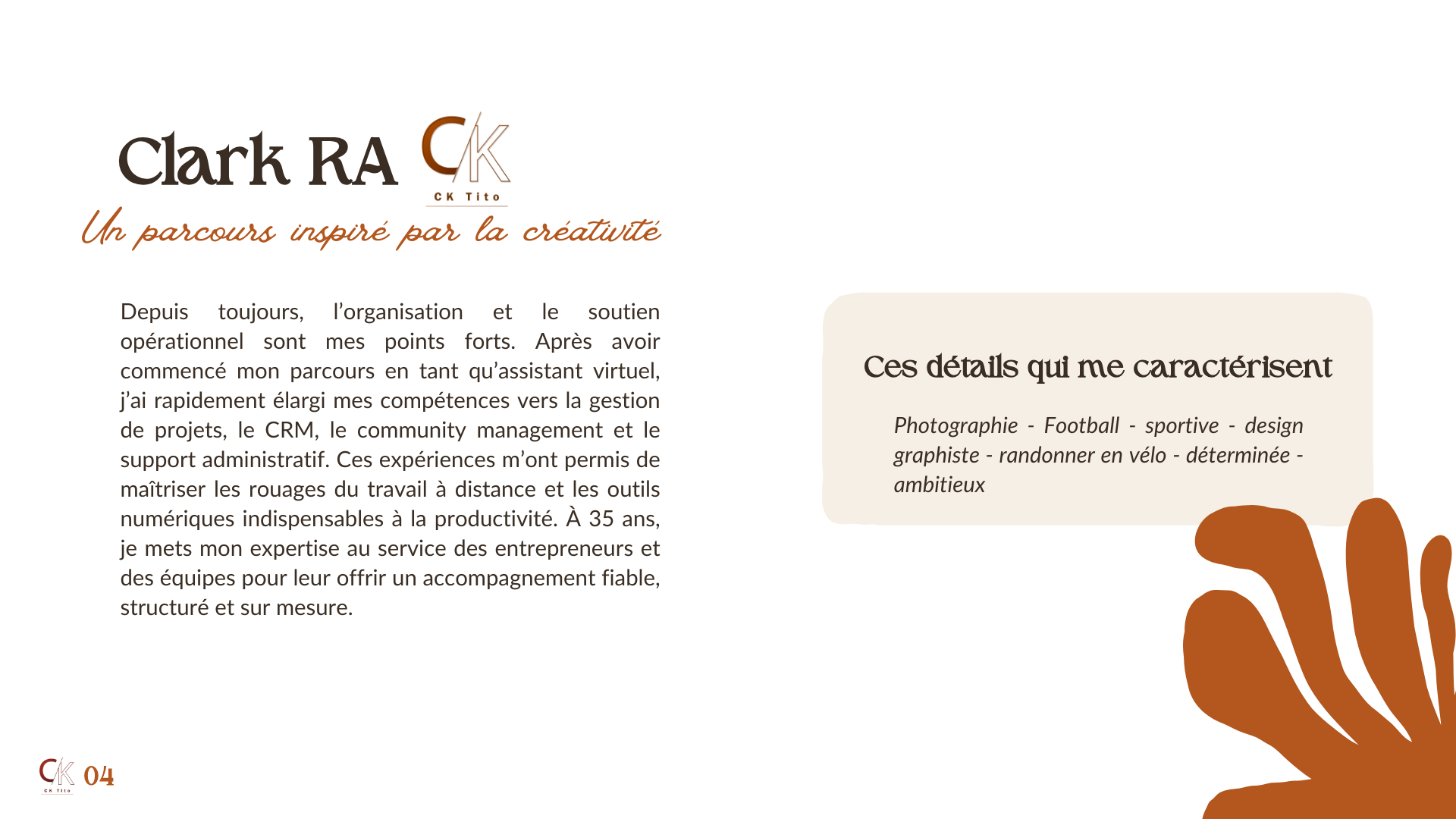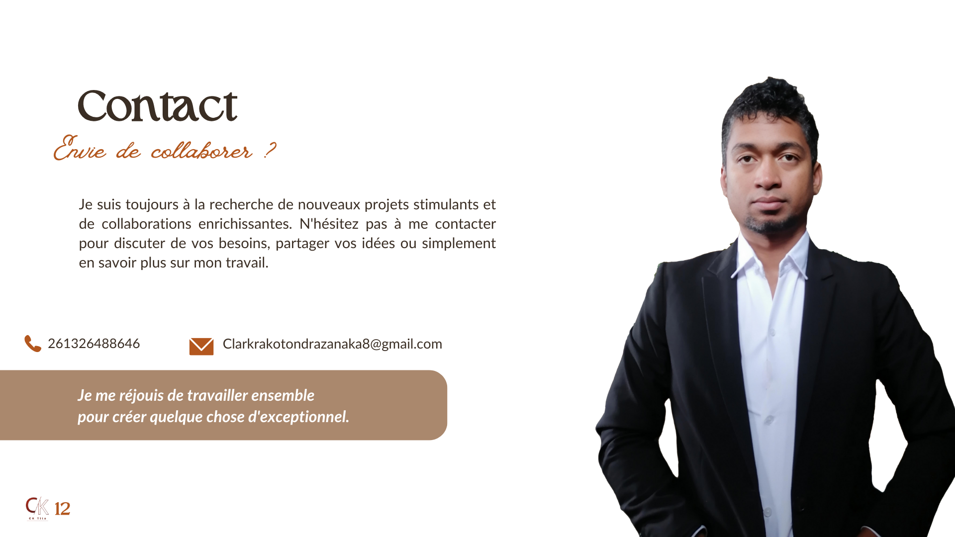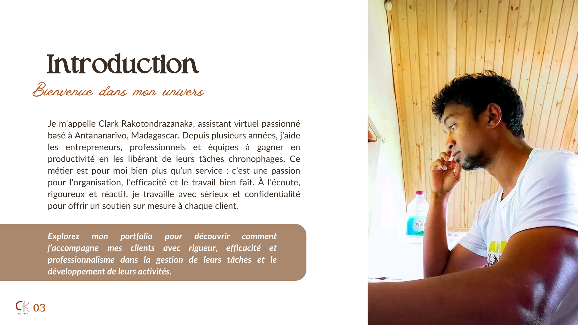 Bonjour ! Moi c’est Clark RAKOTONDRAZANAKA, assistant virtuel freelance depuis 2019, avec plus de 3 ans d’expérience dans le support administratif, la gestion CRM, le marketing digital et la création graphique.