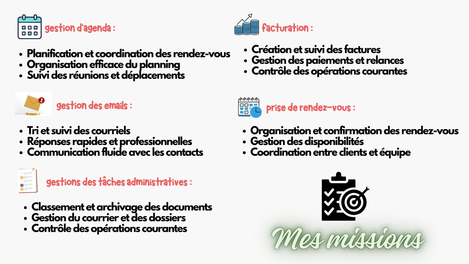 âą La gestion et lâorganisation des emails âą Lâorganisation de lâagenda âą Facturation âą Saisie de donnĂ©es / documents administratifs âą Support client