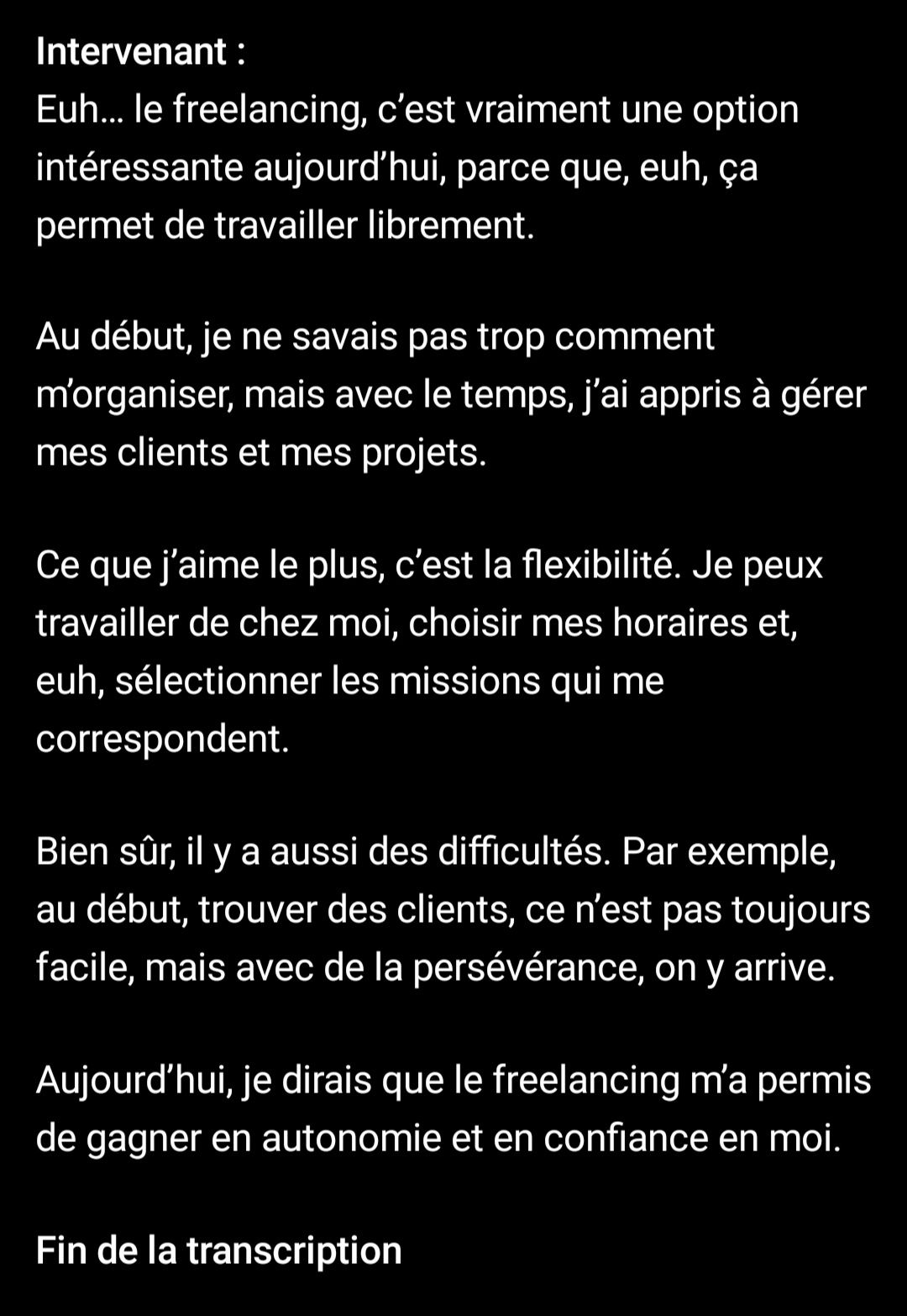 Transcripteur freelance indépendant Réalisation de transcriptions audio (interviews, notes vocales, vidéos) avec attention à la clarté, à l’orthographe et à la ponctuation.