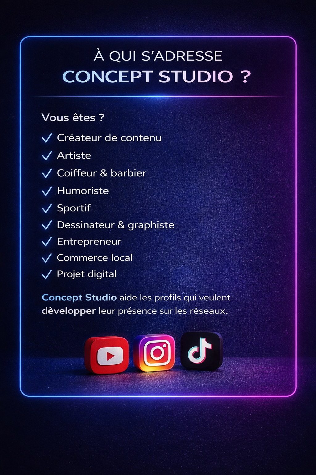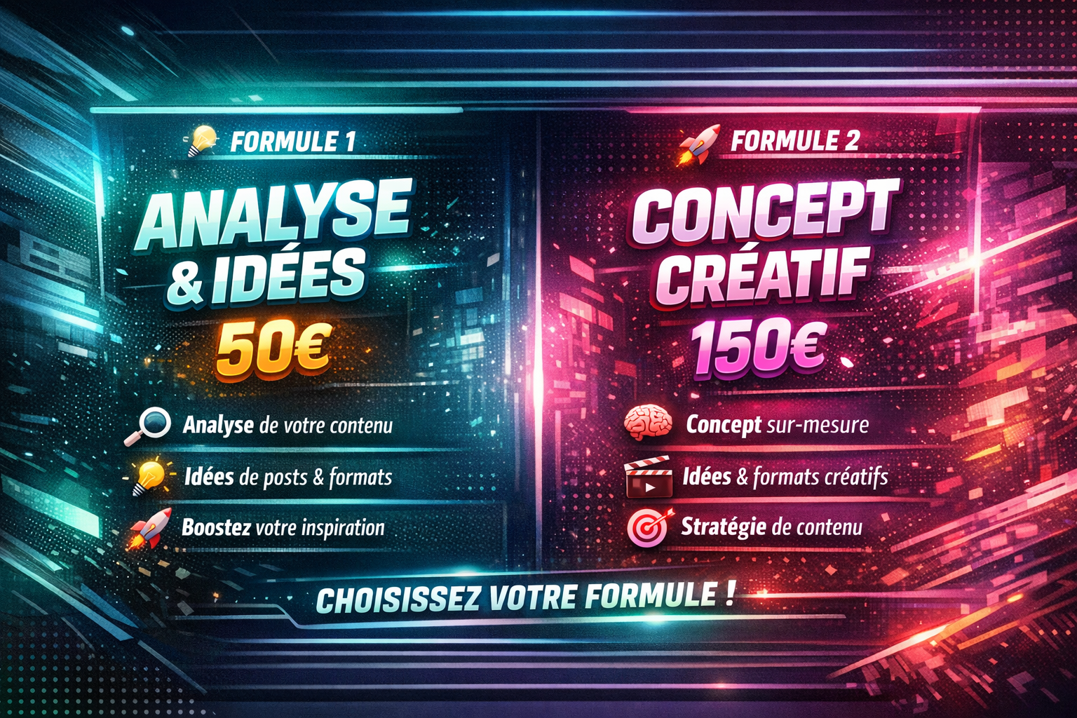 Création de concepts et d’idées de contenu pour réseaux sociaux. Analyse d’univers et propositions de formats créatifs adaptés aux créateurs, entrepreneurs et projets digitaux. Active sur Instagram avec une communauté de plus de 17 600 abonnés