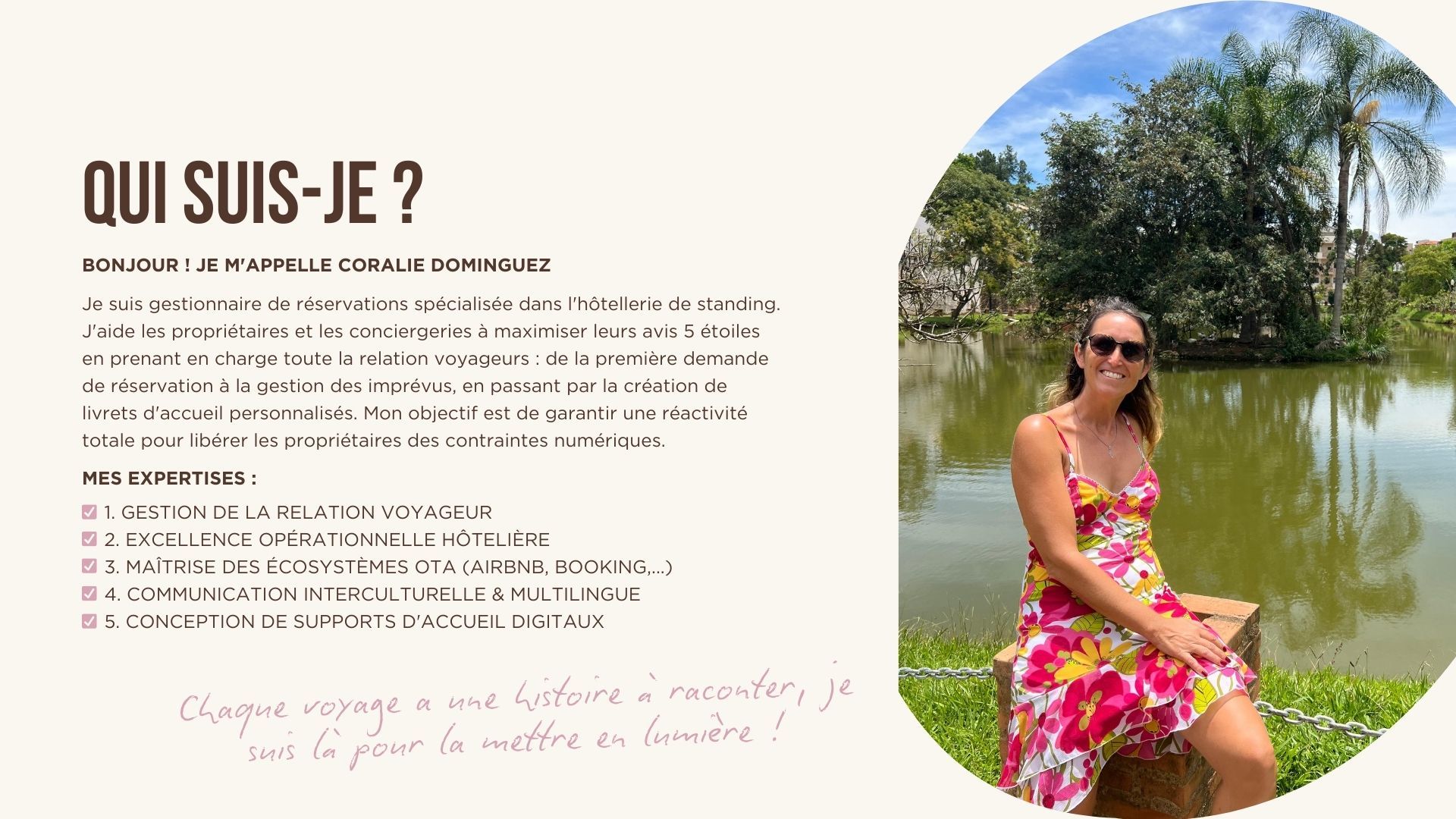 Bonjour ! Je suis une professionnelle de l'hôtellerie et du tourisme maritime, spécialisée dans la gestion d'hébergements de standing et l'accueil de voyageurs. Forte de mon expérience " terrain" dans la gestion de guesthouses et de prestations touristiques privées, j'ai décidé de mettre mon expertise au service des propriétaires qui souhaitent déléguer leur gestion numérique en toute confiance. Ma mission est simple : Libérer votre temps tout en maximisant vos avis 5 étoiles. Je ne me contente pas de répondre à des messages, je crée un lien de confiance avec vos voyageurs avant même leur arrivée. Pourquoi travailler avec moi? -Expériences réelle : Je connais les exigences des voyageurs et les problématiques des propriétaires. -Rigueur & Sourire : Une communication soignée, chaleureuse et toujours orientée solution. -Sérénité : Je traite votre logement comme s'il s'agissait du mien. Confiez-moi la relation avec vos voyageurs et concentrez-vous sur l'essentiel. Discutons dès maintenant de votre projet !