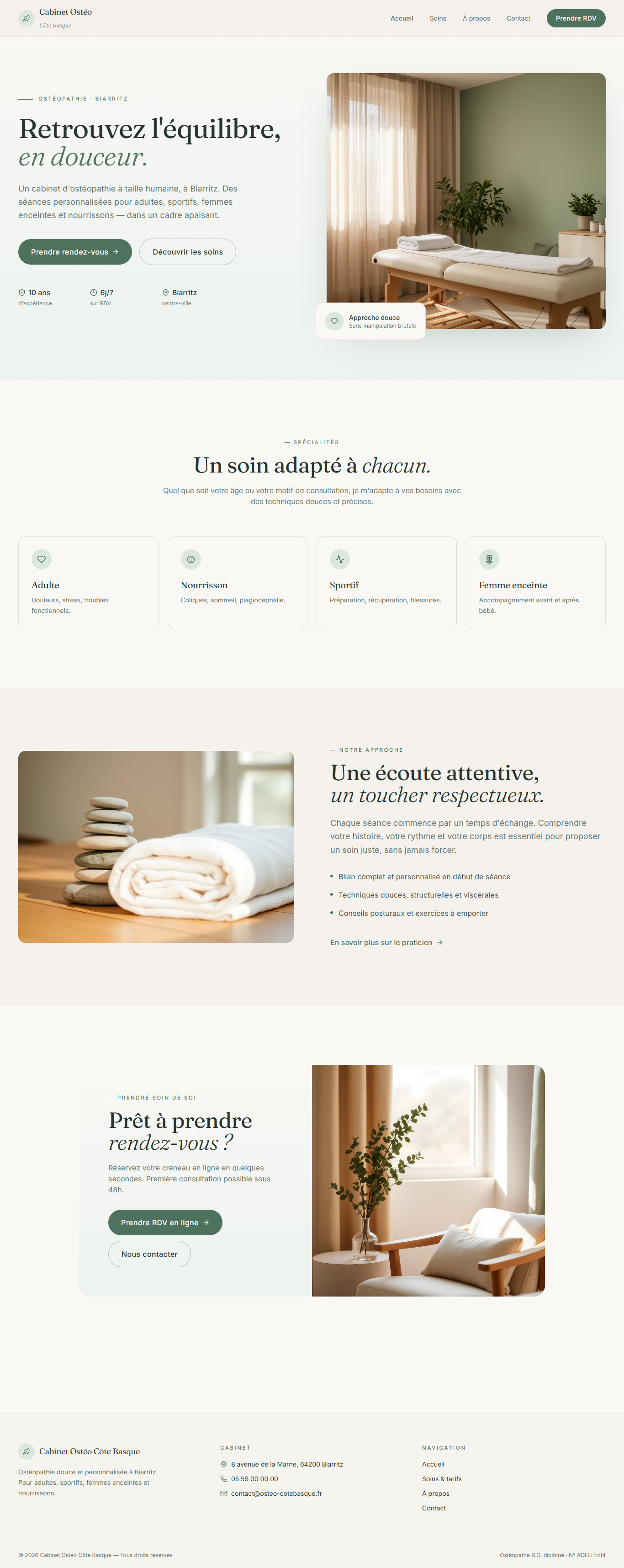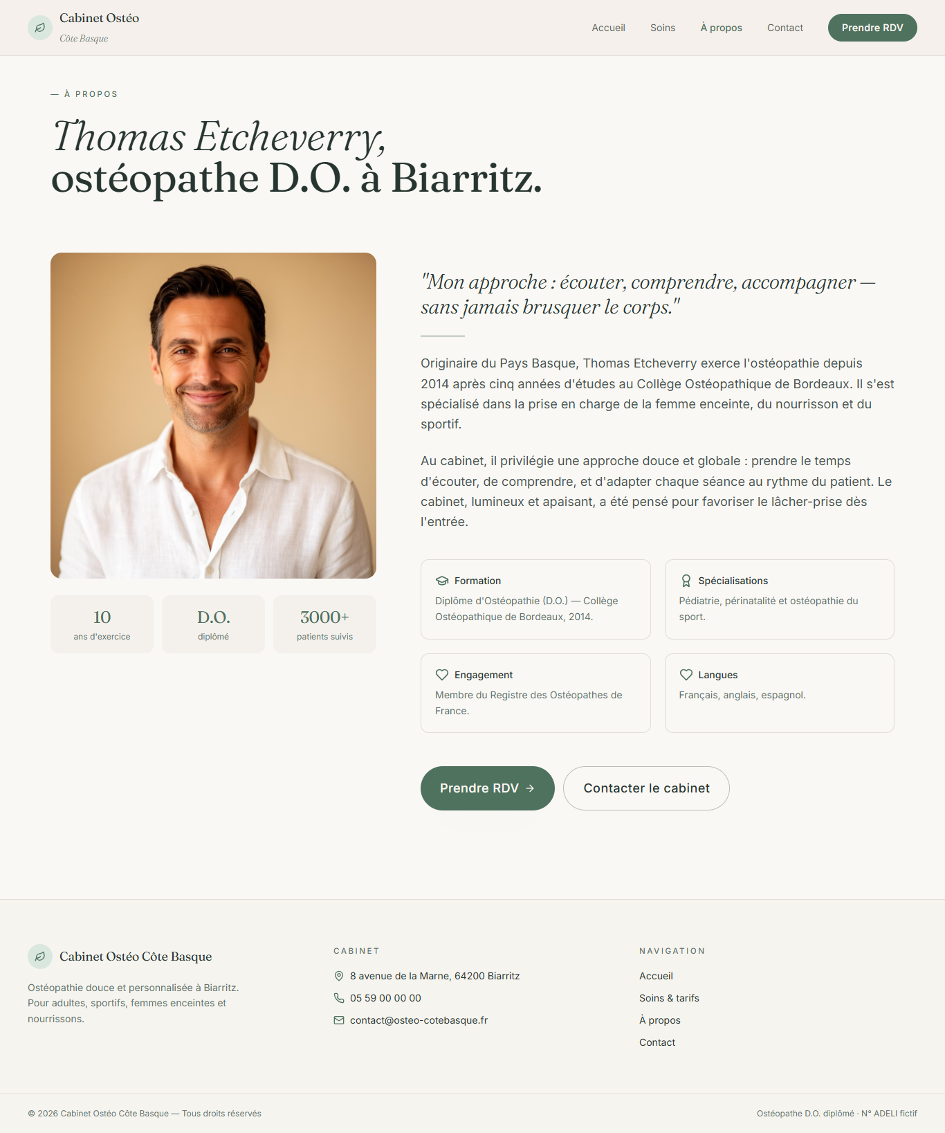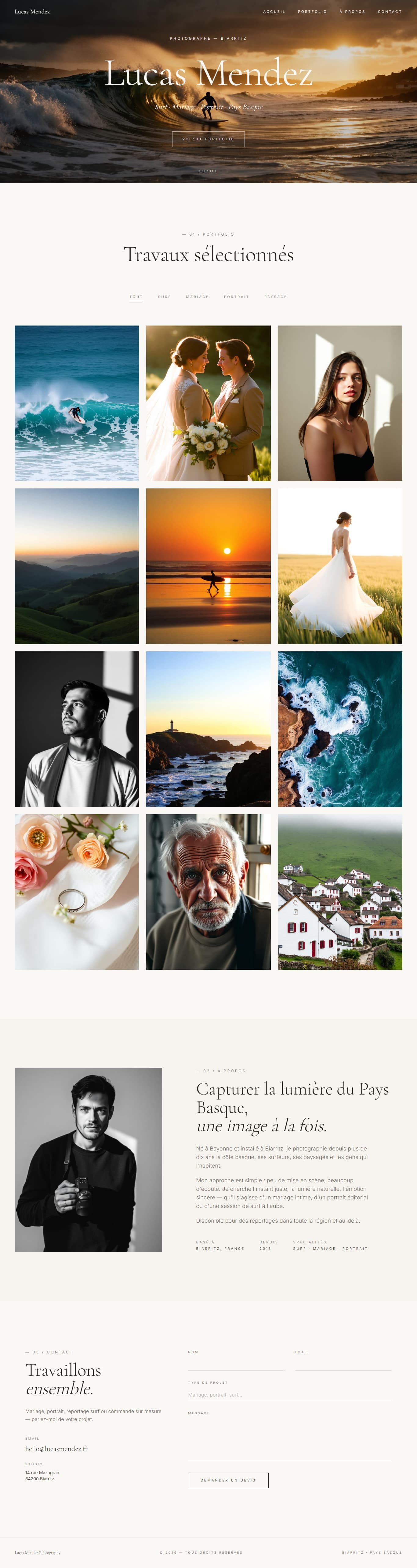 Développeur web freelance spécialisé dans la création de sites vitrines pour les professionnels locaux de partout en France, j'aide les artisans, thérapeutes, photographes et commerçants à avoir une présence en ligne professionnelle qui attire de nouveaux clients. Chaque site que je crée est moderne, rapide, adapté mobile, et inclut une prise de RDV en ligne pour que vos clients puissent réserver directement — sans allers-retours par téléphone. Basé au Pays Basque, j'interviens localement et à distance partout en France.