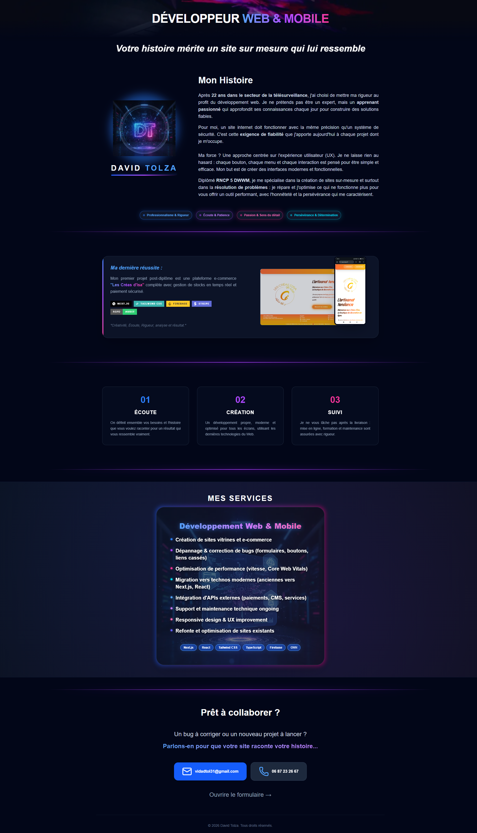 Une expertise concrète : J’ai récemment réalisé un site e‑commerce complet avec React, Next.js, Tailwind et Firebase. Ce projet m'a permis de maîtriser des fonctionnalités avancées :
