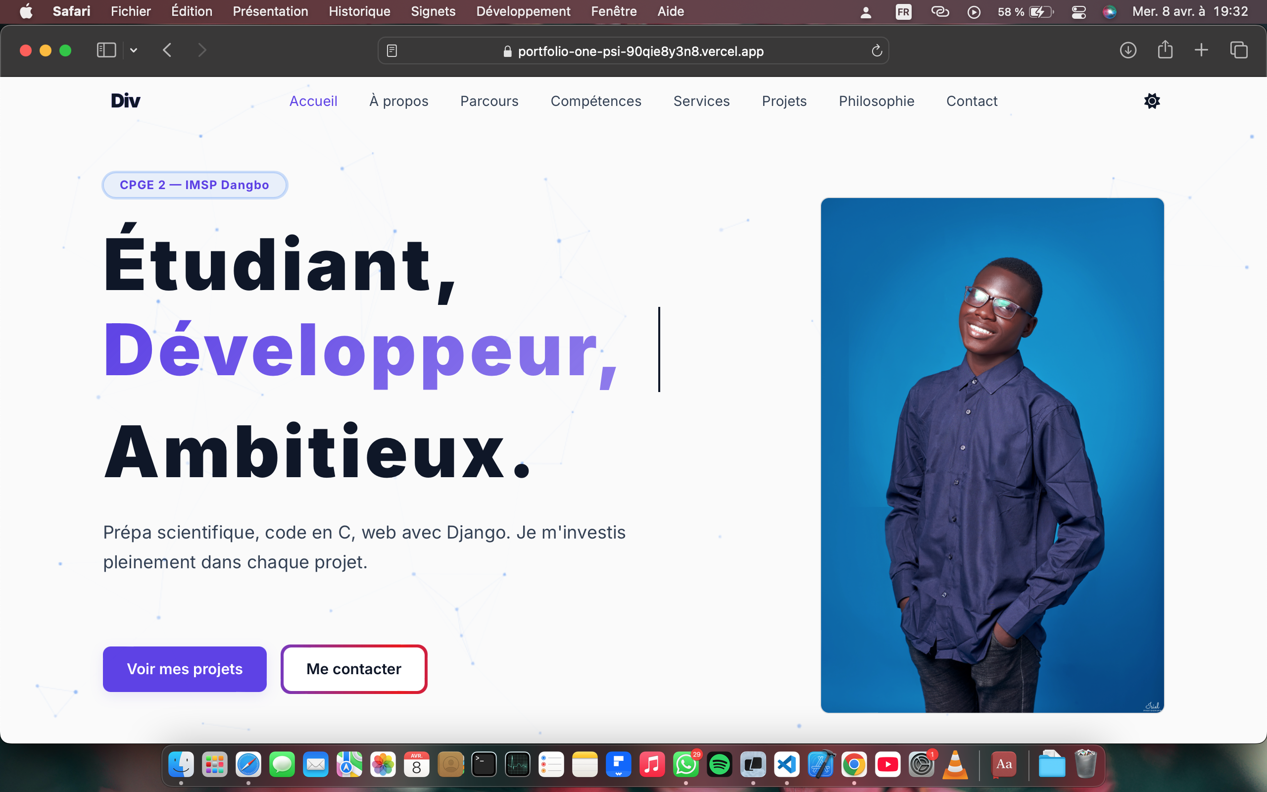 👋 Moi c'est Divin, Développeur Full Stack Django/Python, étudiant en classes préparatoires ingénieur à l'IMSP (Institut de Mathématiques et de Sciences Physiques, Bénin), l'une des meilleures formations scientifiques d'Afrique francophone.