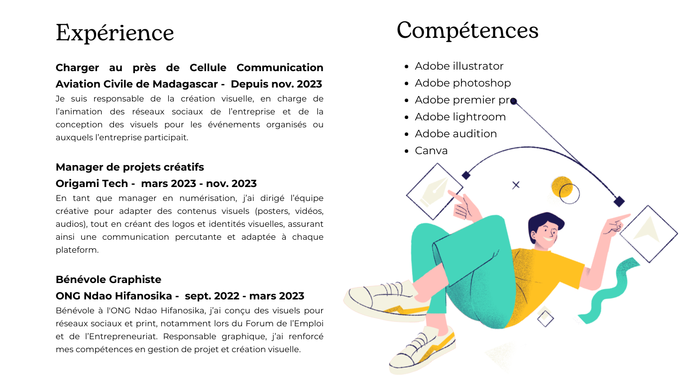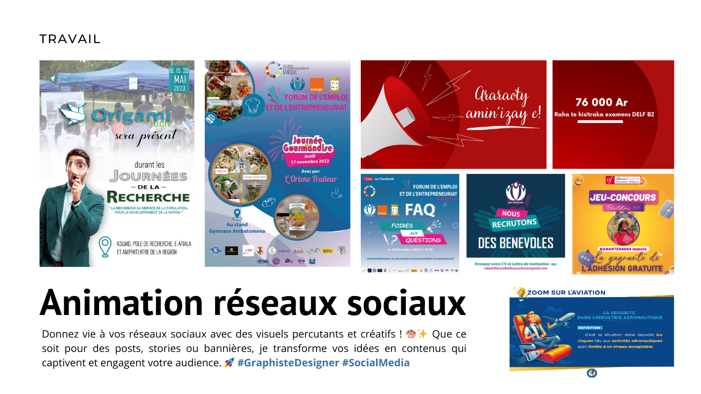 Bénévole à l'ONG Ndao Hifanosika, j’ai conçu des visuels pour réseaux sociaux et print, notamment lors du Forum de l’Emploi et de l’Entrepreneuriat. Responsable graphique, j’ai renforcé mes compétences en gestion de projet et création visuelle.