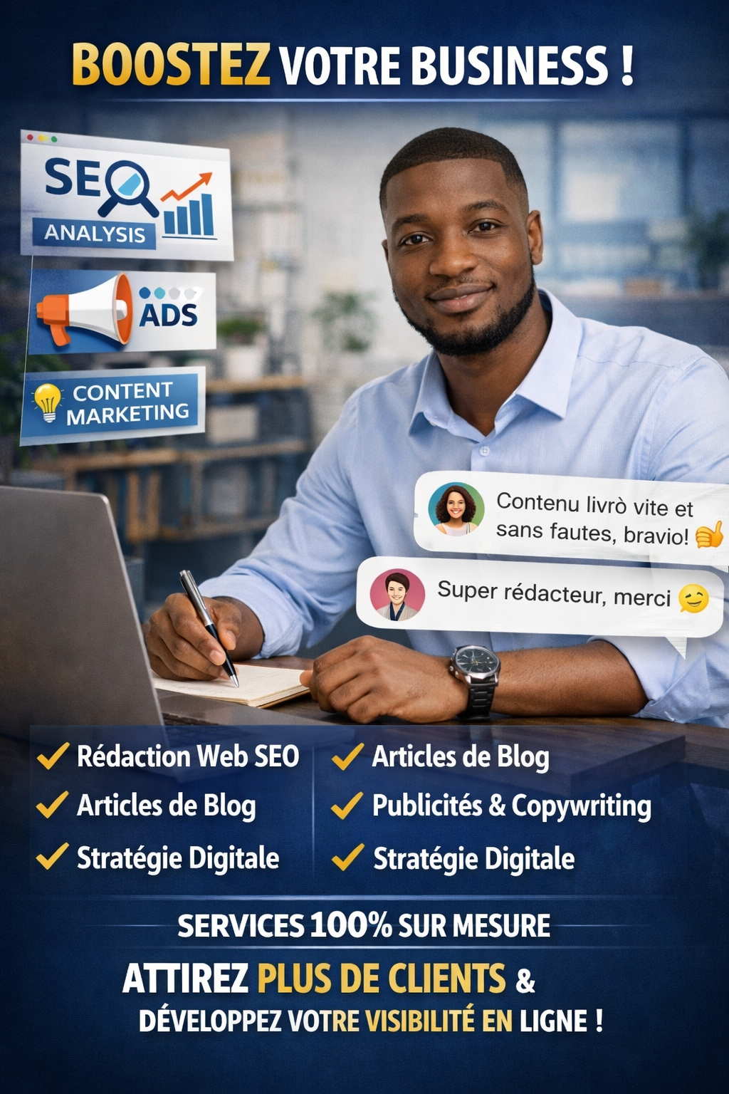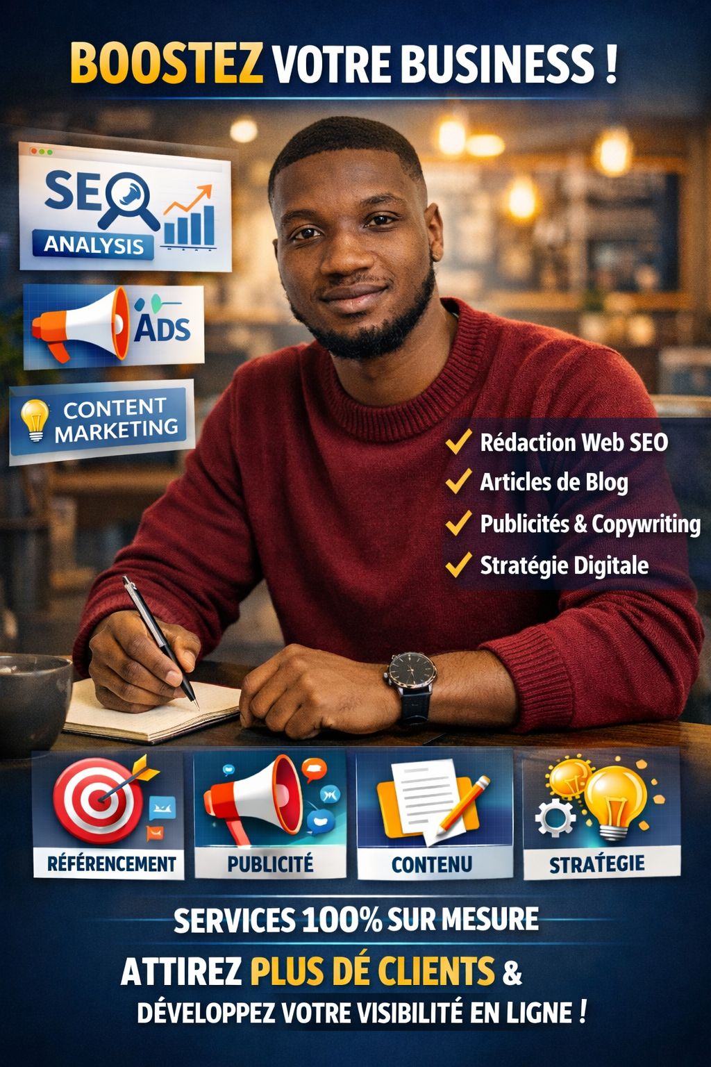Je suis un rédacteur web passionné, spécialisé dans la création de contenus uniques, optimisés SEO et engageants pour sites web, blogs, réseaux sociaux et campagnes publicitaires. Mon objectif est d’aider les entreprises et entrepreneurs à attirer plus de clients, améliorer leur visibilité en ligne et renforcer leur image de marque grâce à des textes percutants et professionnels.