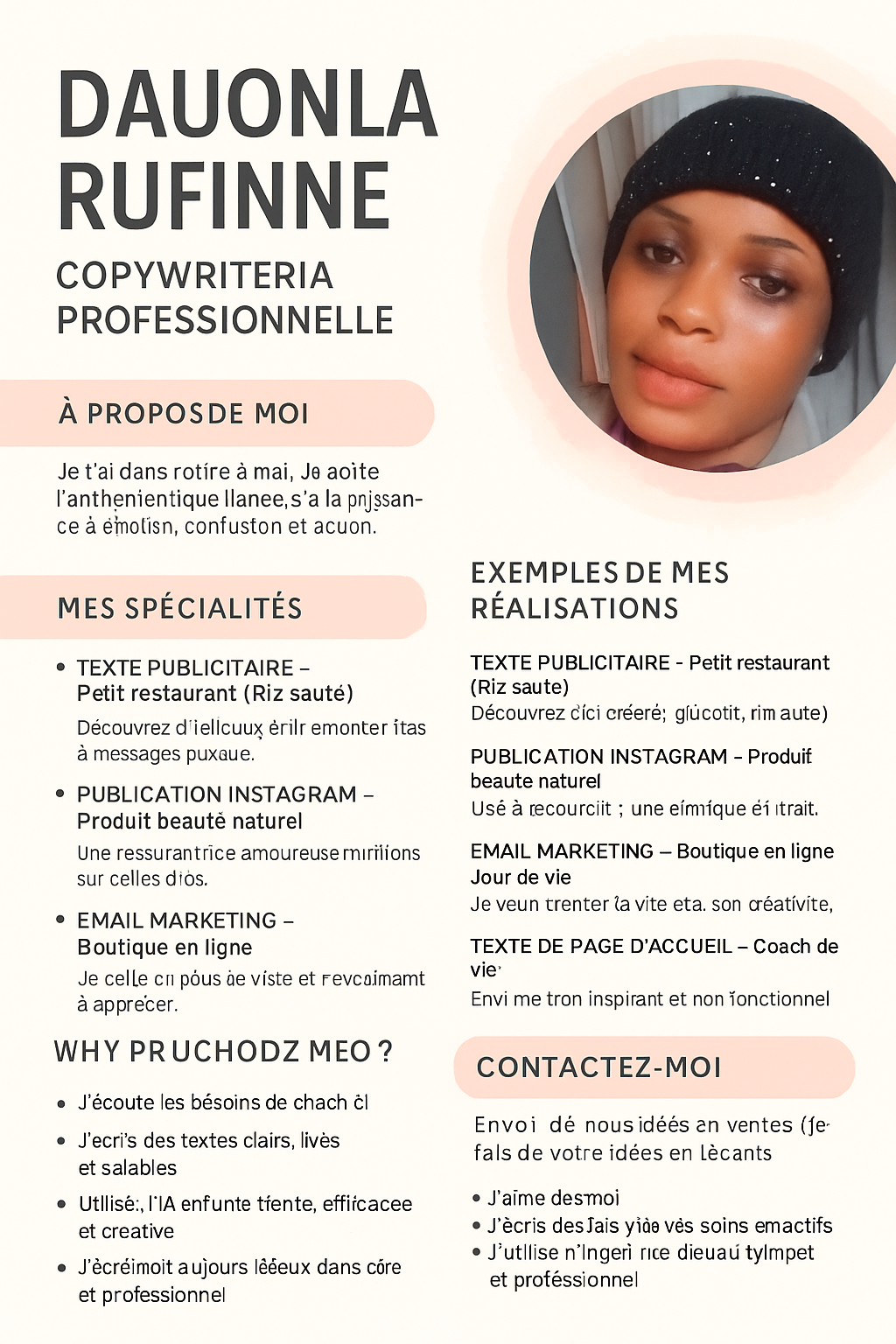 Bonjour 👋 Je suis Dauonla Rufinne, passionnée par les mots et la communication. J’aide les entrepreneurs et les marques à vendre plus facilement grâce à des textes percutants créés avec l’aide de l’intelligence artificielle 🤖✍️