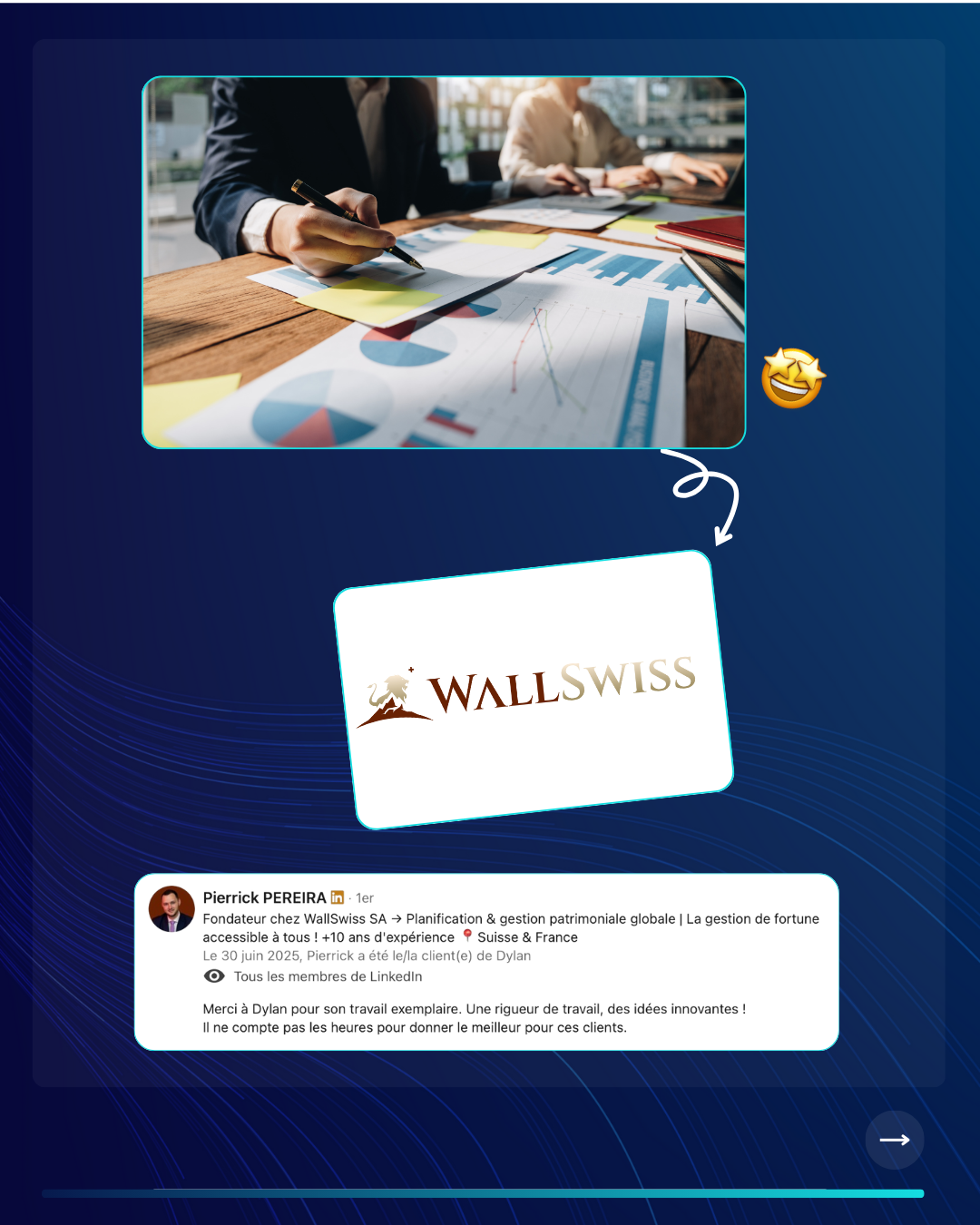 Stratégie marketing LinkedIn avec +50 clients (2024–2025) dont le plus grand cabinet de gestion de fortune de Genève, personal branding, SEO, coaching. 7 e-books (150 ventes), e-learning (50 users), SaaS analytics (35), ads & sites web.