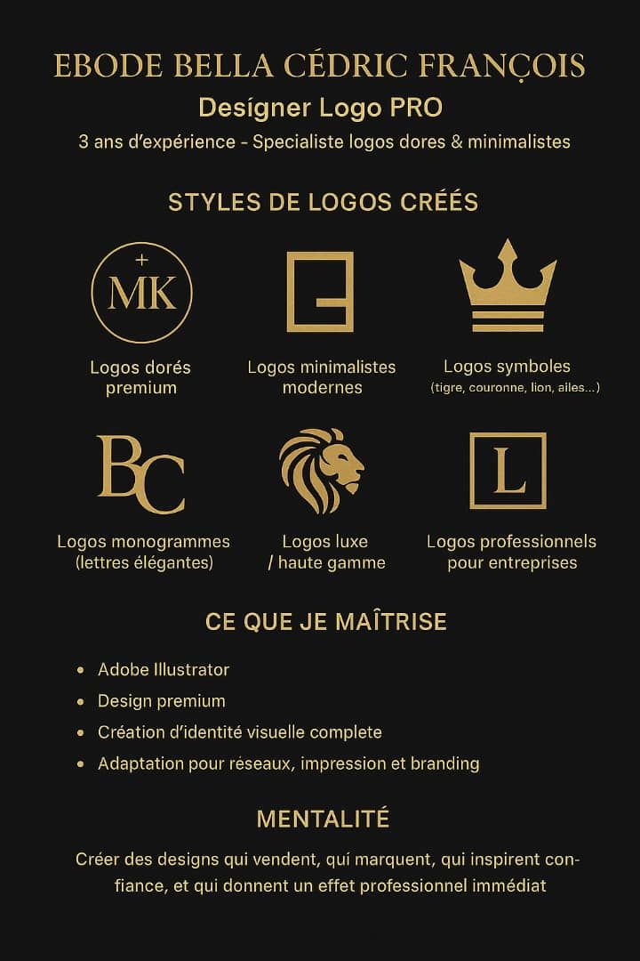 Je m’appelle Ebode Bella Cédric François, designer graphique spécialisé en création de logos modernes et professionnels, avec 5 ans d’expérience en graphisme et dessin.