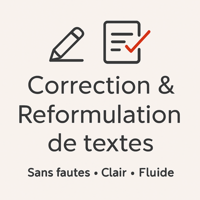 Grâce à mon travail, vos textes deviennent clairs, fluides et professionnels, que ce soit pour : • Emails ou messages professionnels • Devoirs, rapports ou documents scolaires • Présentations, documents administratifs • Tout texte que vous souhaitez rendre impeccable