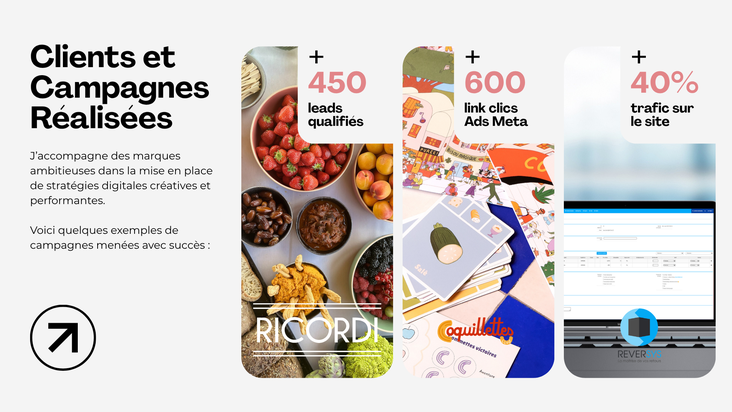 J’accompagne mes clients, principalement PME et e-commerçants, dans la génération rapide de prospects et la maximisation de leur ROAS, sans jargon inutile. Je délivre aussi des reportings clairs et exploitables, pour que tu puisses suivre facilement les résultats et identifier les axes de croissance.