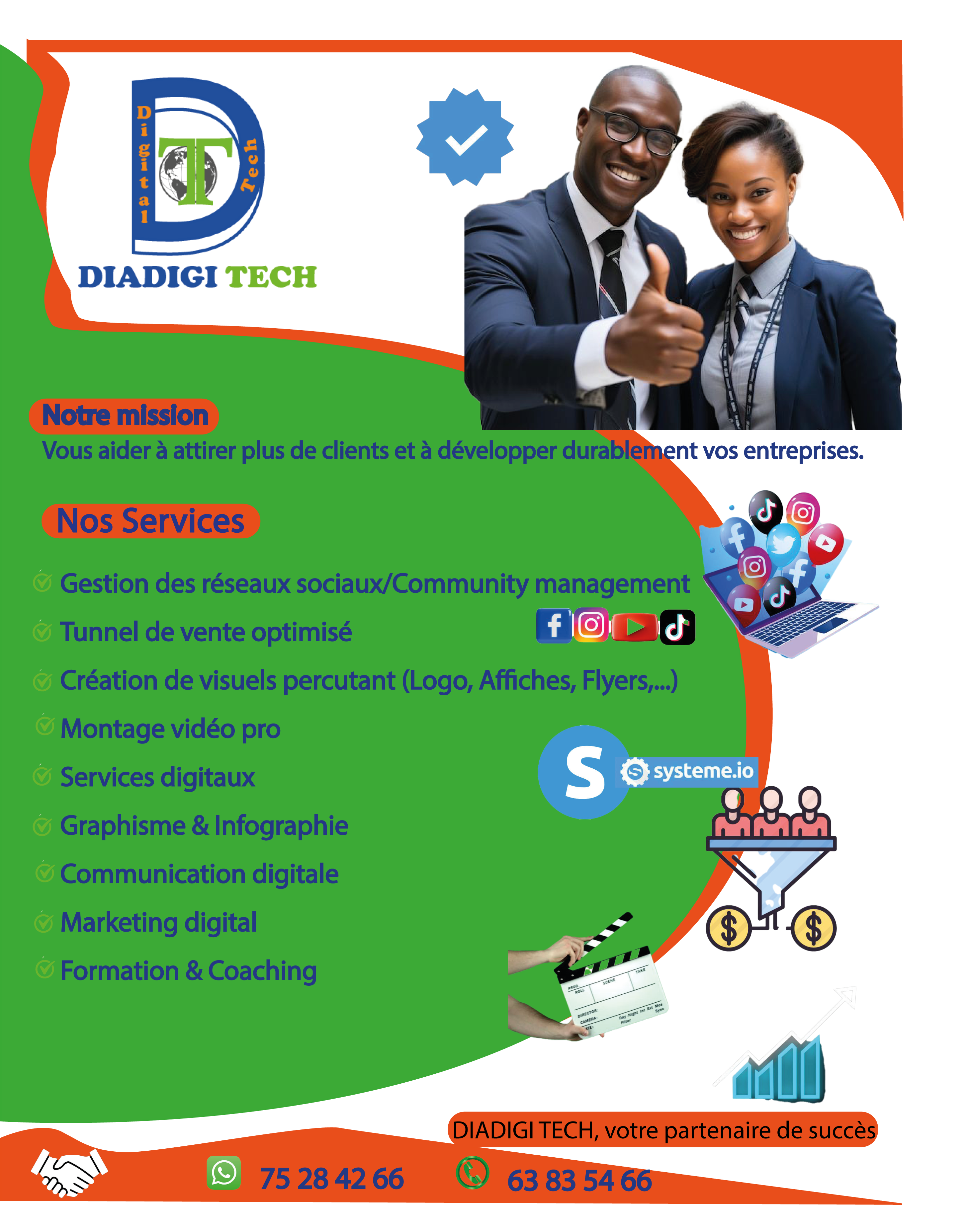 Je suis Diabate Daouda, entrepreneur digital passionné et fondateur de DIADIGI TECH, une entreprise spécialisée dans le digital, le marketing en ligne et les technologies futures.