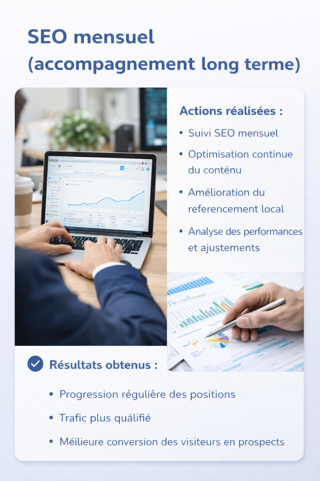 Je vais optimiser le référencement de votre site chaque mois pour améliorer votre visibilité sur Google