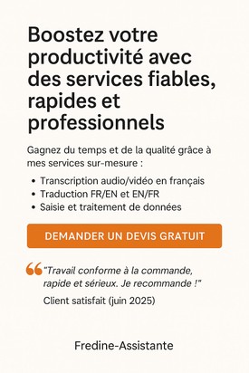 Pour une aide sur mesure dans vos projets de transcription, correction, saisie ou mise en page, n’hésitez pas à me contacter pour discuter de vos besoins spécifiques.