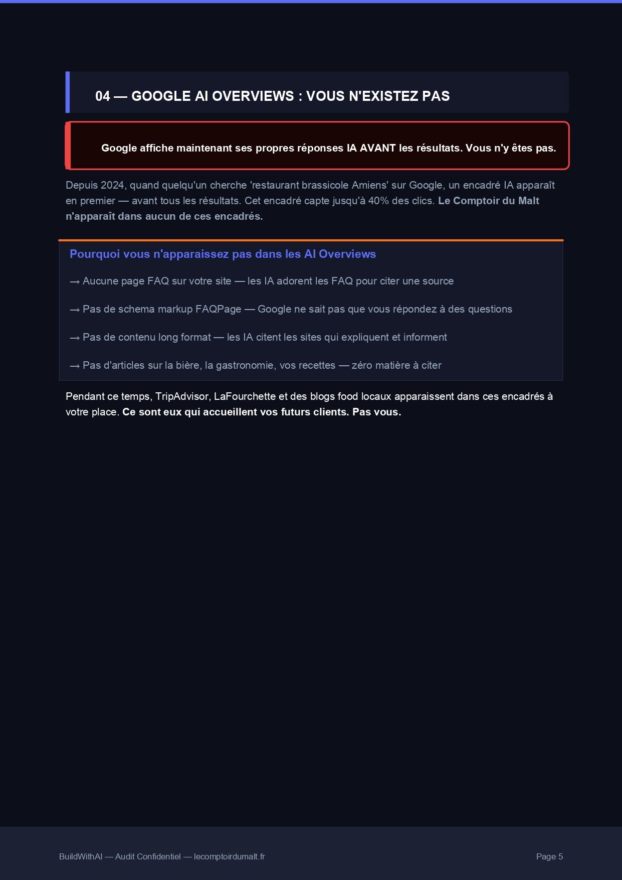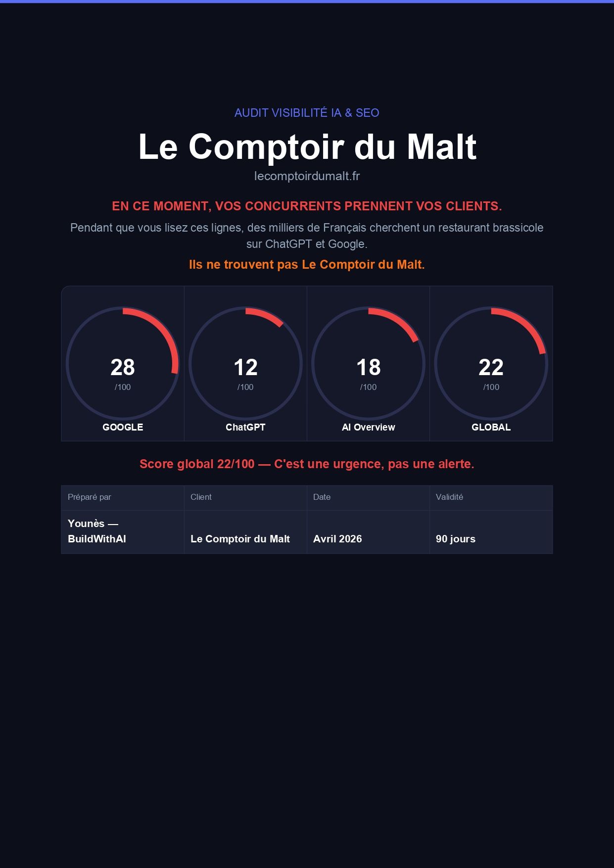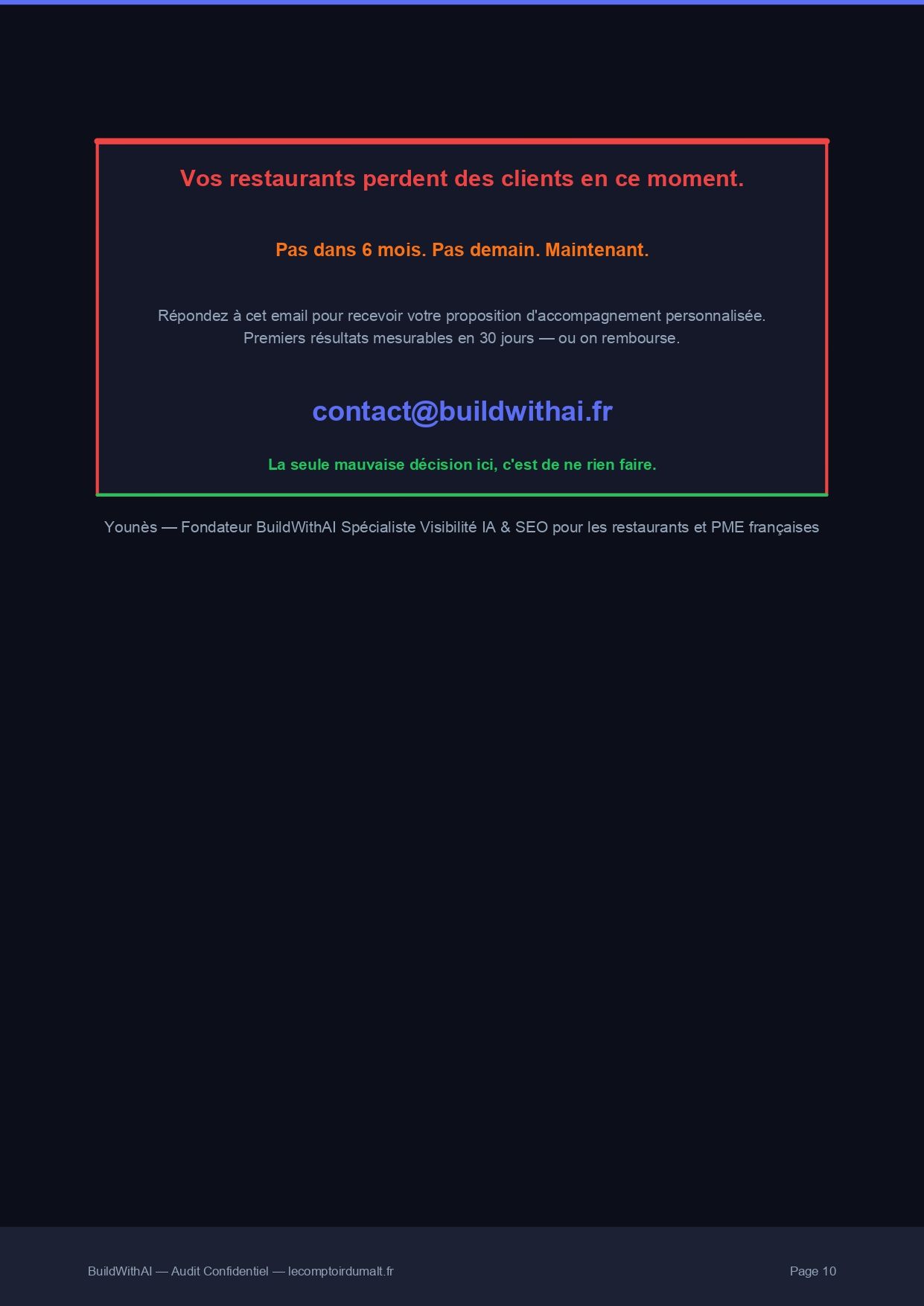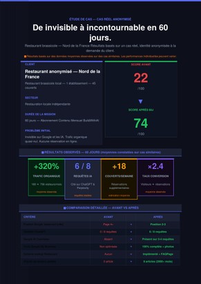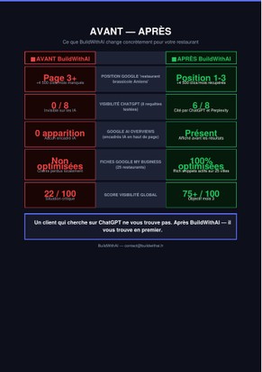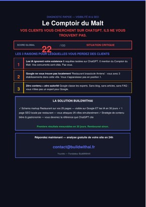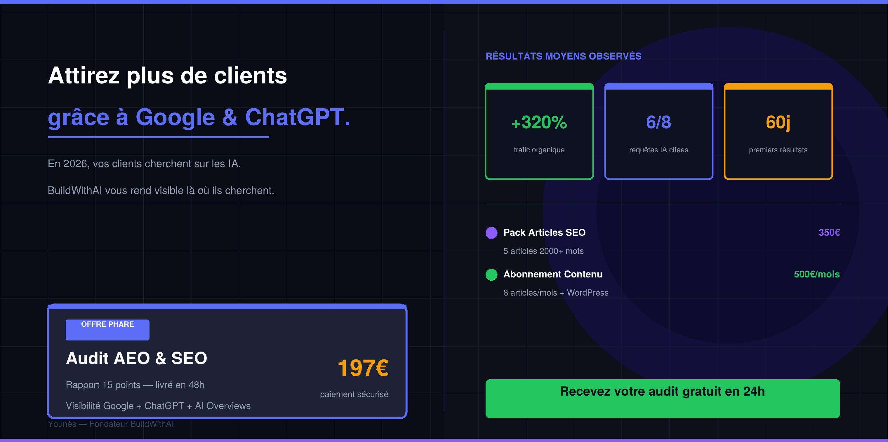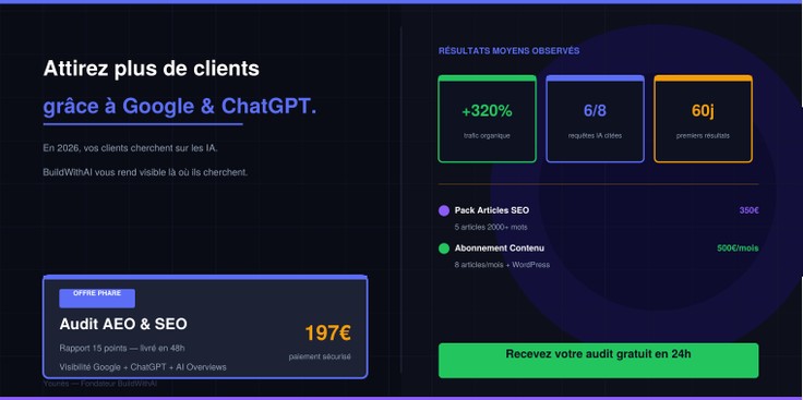 Ce que je fais concrètement : — Audit de visibilité Google + IA en 48h Vous recevez un rapport clair avec vos pertes chiffrées et un plan d'action prioritaire — Contenus SEO & AEO qui attirent des clients qualifiés Articles optimisés pour Google ET pour les réponses des IA — votre nom apparaît là où vos clients cherchent — Gestion réseaux sociaux automatisée Posts créés, programmés et publiés chaque mois — vous ne faites rien — Chatbot IA installé sur votre site Il répond à vos clients, capte des leads et travaille à votre place 24h/24