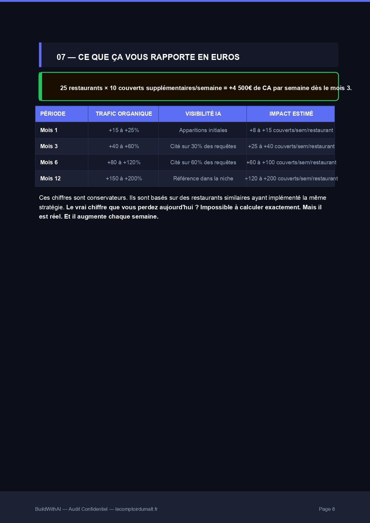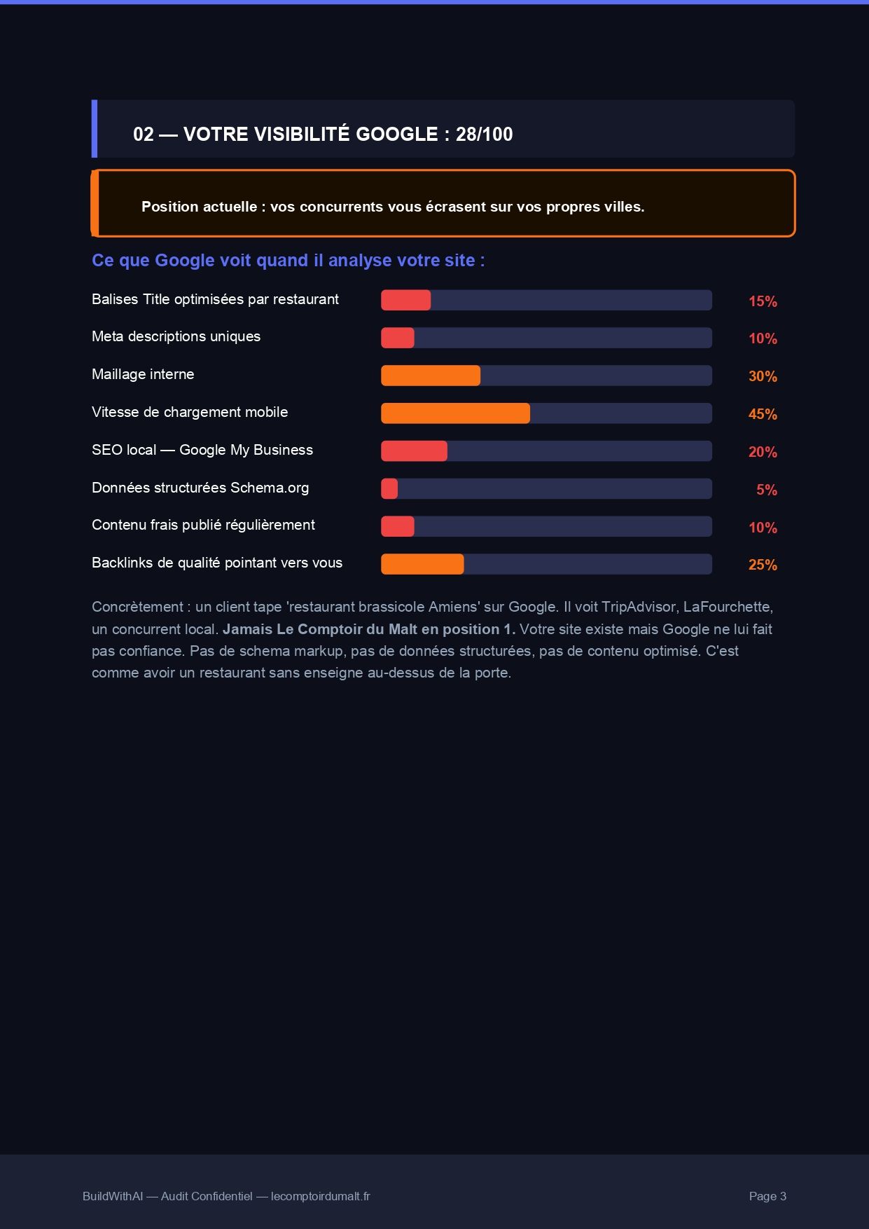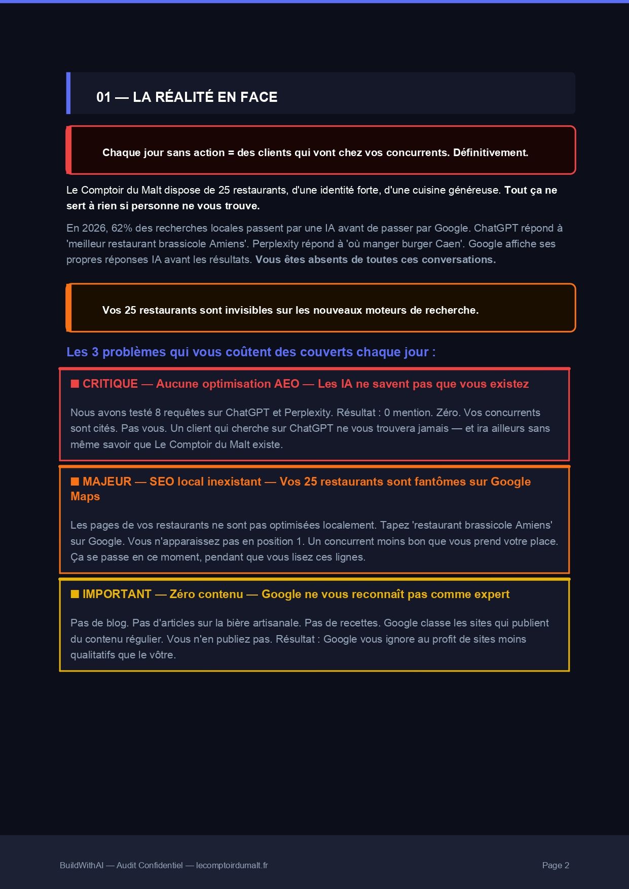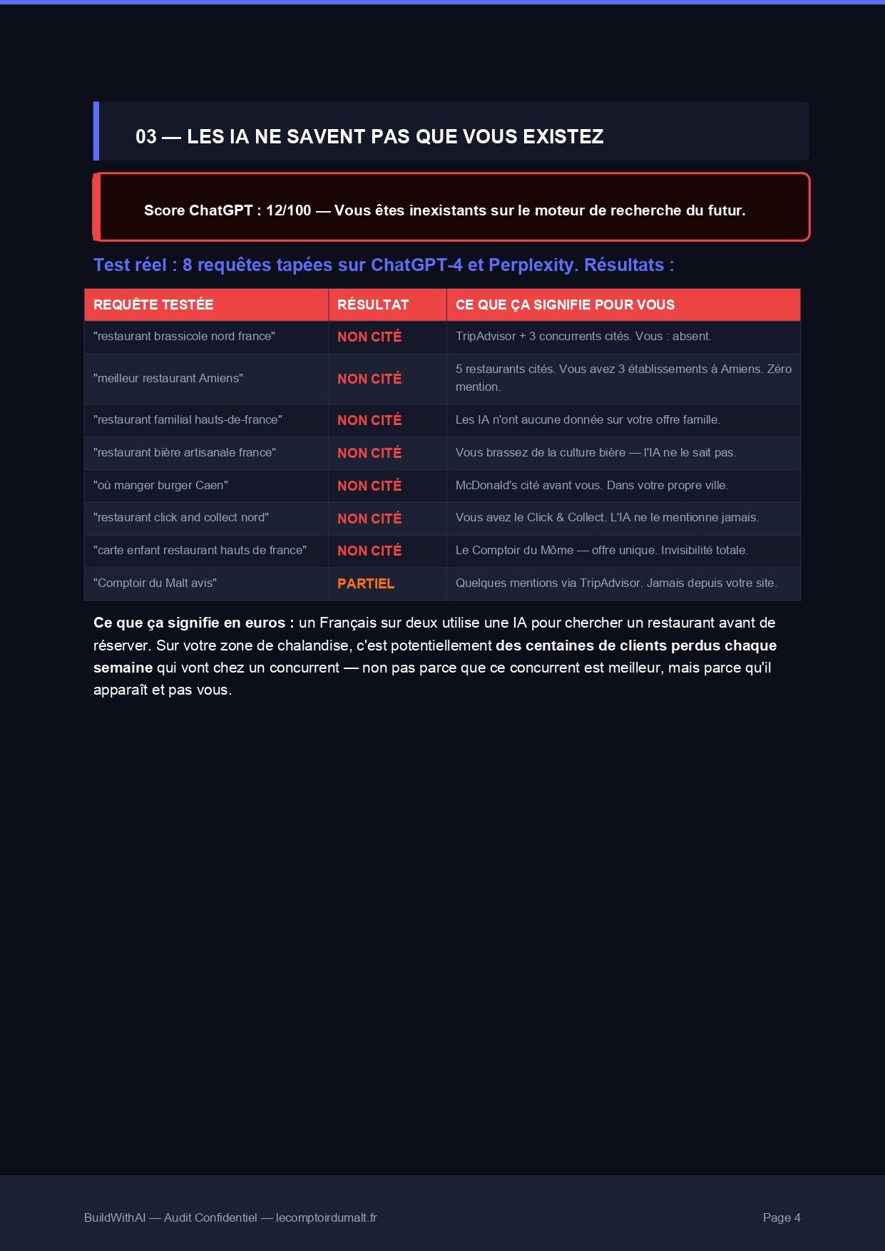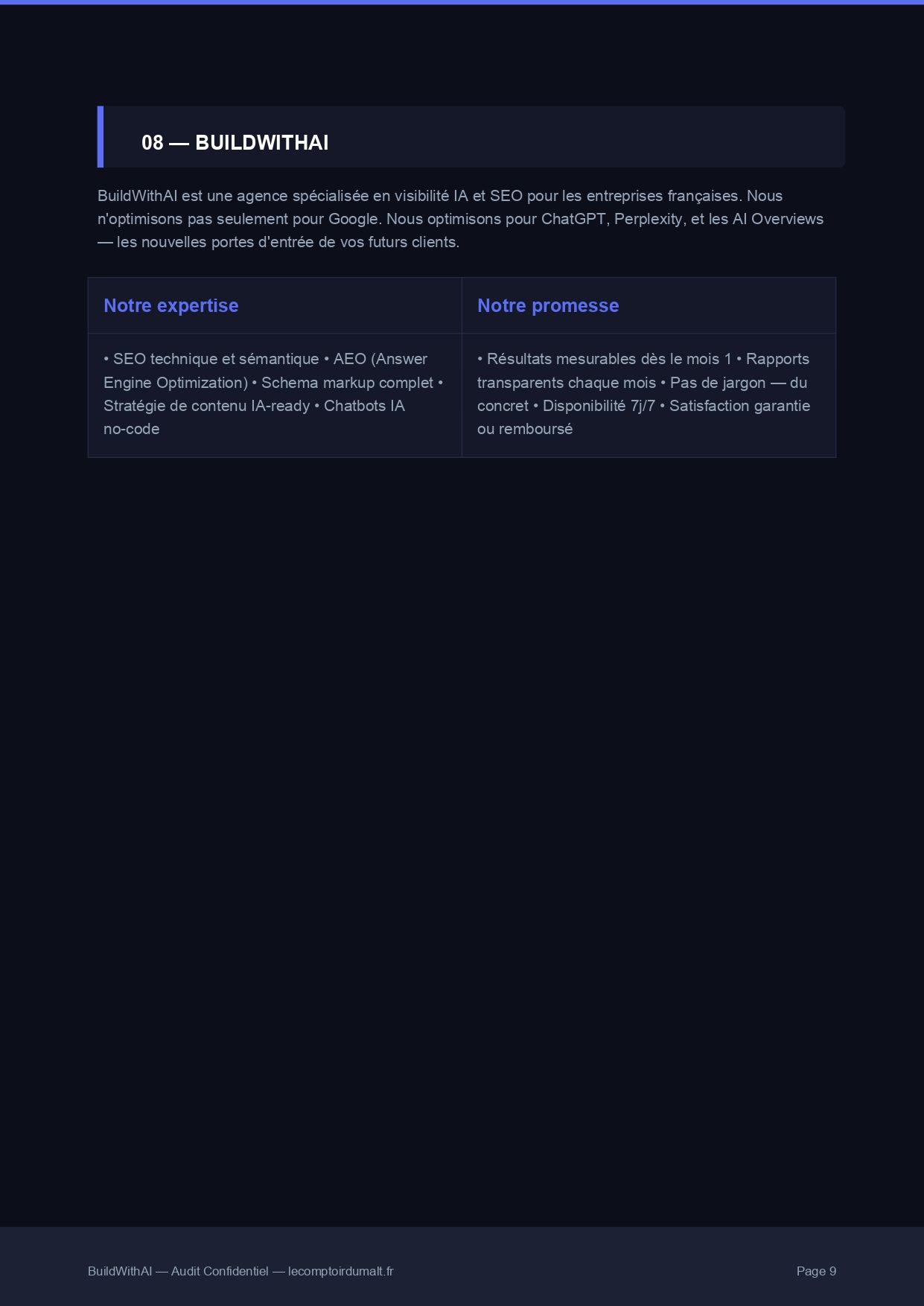 Ce que je fais concrètement : — Audit de visibilité Google + IA en 48h Vous recevez un rapport clair avec vos pertes chiffrées et un plan d'action prioritaire — Contenus SEO & AEO qui attirent des clients qualifiés Articles optimisés pour Google ET pour les réponses des IA — votre nom apparaît là où vos clients cherchent — Gestion réseaux sociaux automatisée Posts créés, programmés et publiés chaque mois — vous ne faites rien — Chatbot IA installé sur votre site Il répond à vos clients, capte des leads et travaille à votre place 24h/24