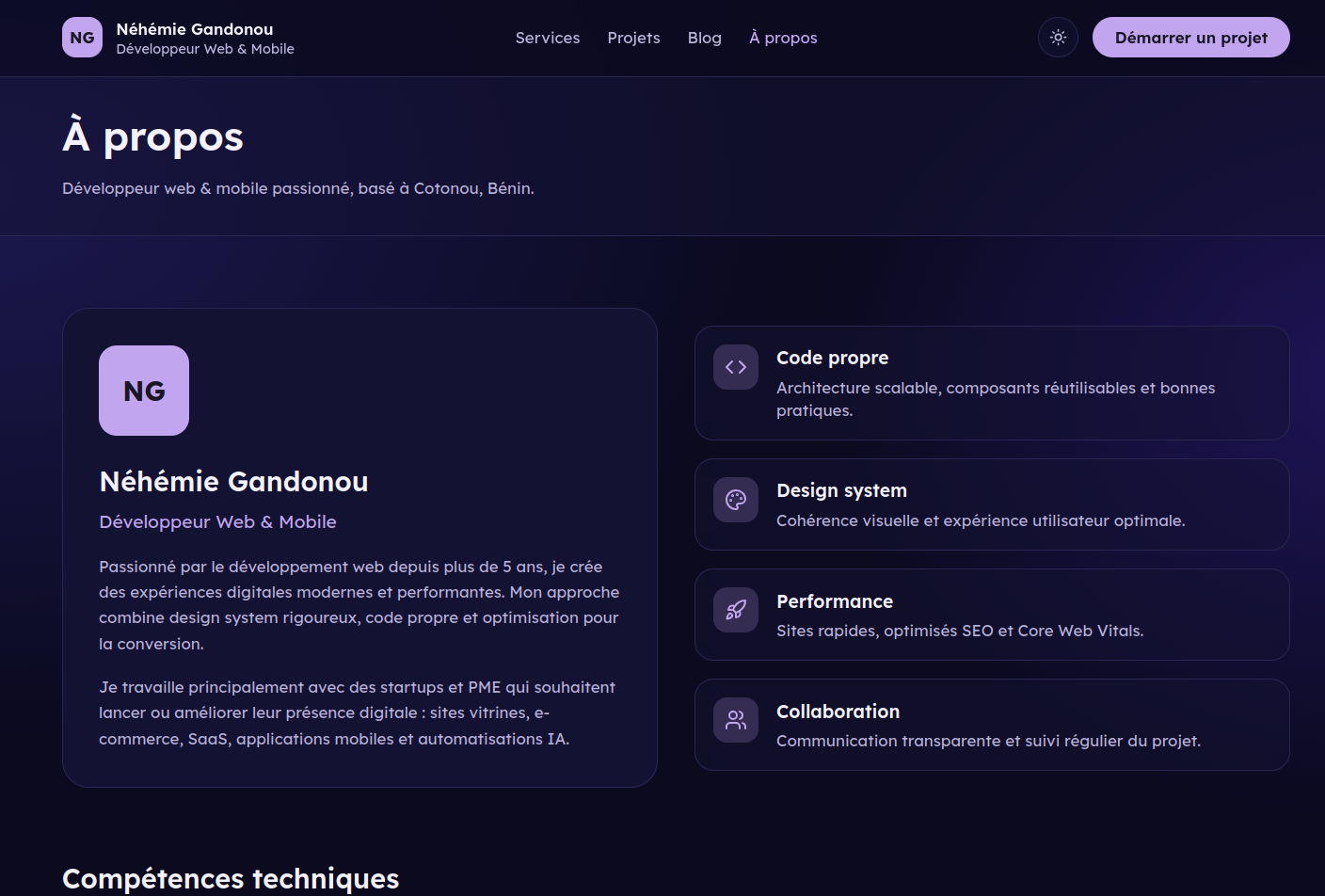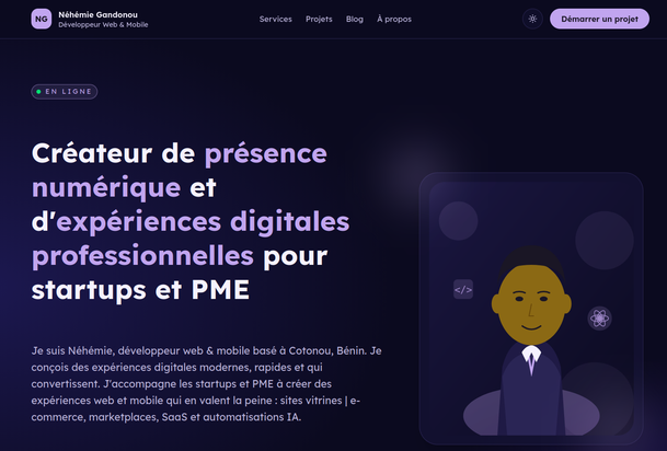 Je suis Néhémie, créateur de présence numérique et d'expériences digitales pour startups et PME depuis plusieurs années. Je construis des produits digitaux robustes et complets qui simplifient votre quotidien, accélèrent votre activité et font sourire vos utilisateurs. 😊