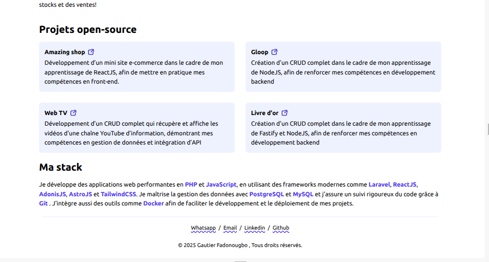 Bonjour 👋, je suis Gautier, développeur web Full-Stack, spécialisé dans la création de sites modernes, SaaS performants et applications web sur mesure. J’utilise Laravel pour un back-end robuste, React.js pour des interfaces dynamiques, Tailwind CSS pour un design moderne et TypeScript pour un code fiable et maintenable.