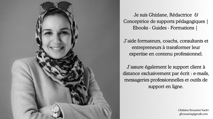Je suis rédactrice professionnelle spécialisée dans la conception et la structuration de supports. J'accompagne les formateurs, consultants, PME et e-commerçants dans la production de contenus clairs, opérationnels et directement utilisables: procédures, guides, supports de formation, scripts SAV.