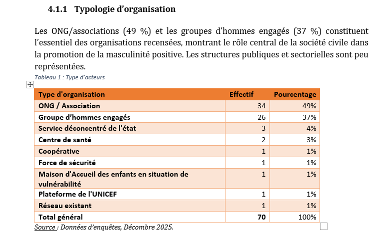 MISSION : Cartographie des OSC intervenant dans la promotion et la protection des femmes et des filles. Participation à l’élaboration d’outil d’enquête Digitalisation de Formulaire d’enquête Supervision de la collecte Traitements et an -