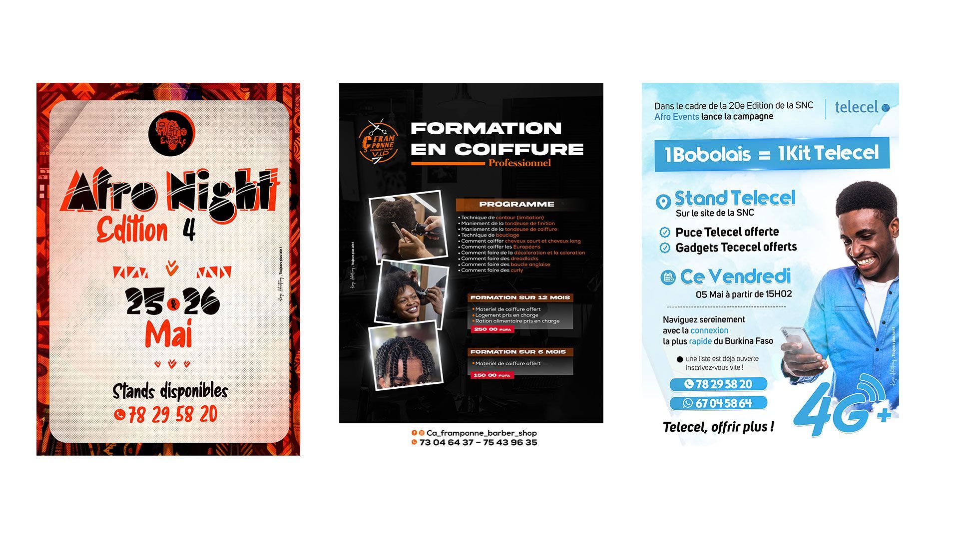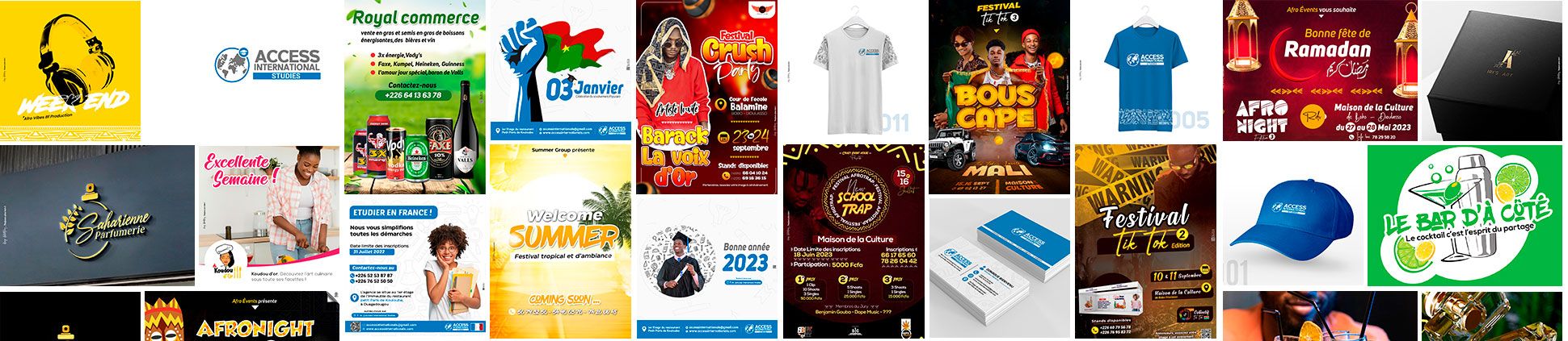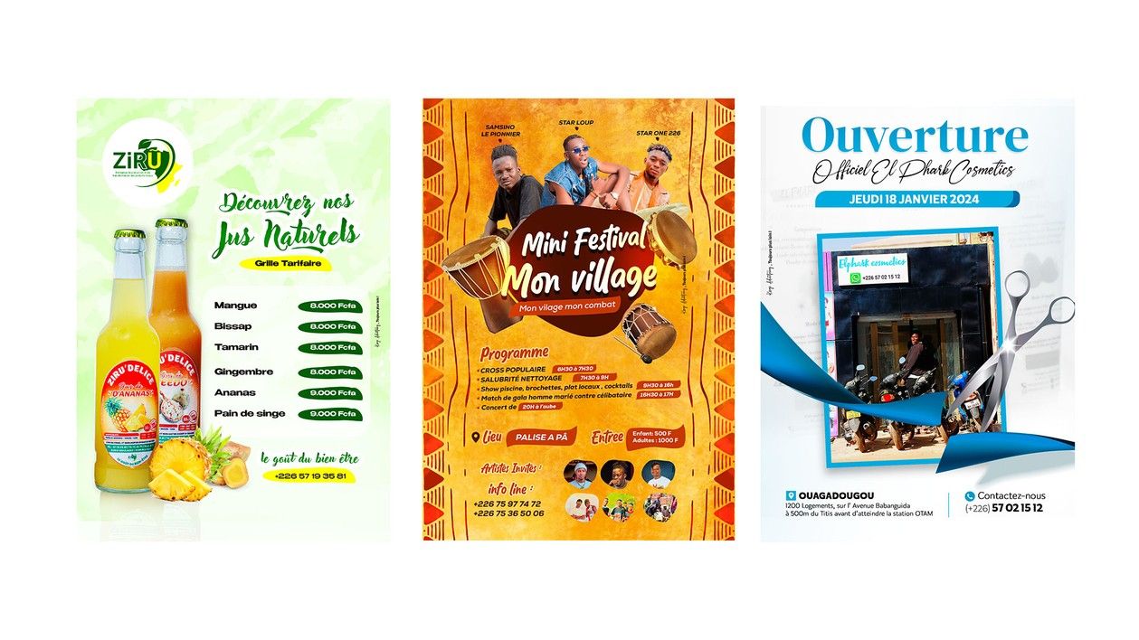En tant que graphiste indépendant, j’ai conçu et exécuté divers supports de communication pour des entreprises et des particuliers, en particulier au Burkina Fas, Côte d’Ivoire, France et Sénégal. -