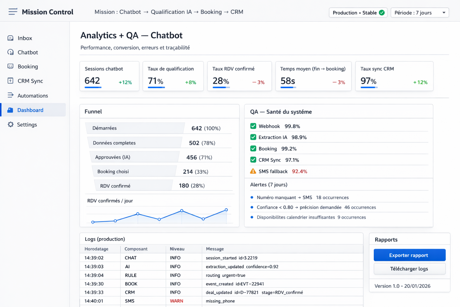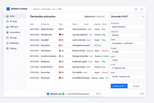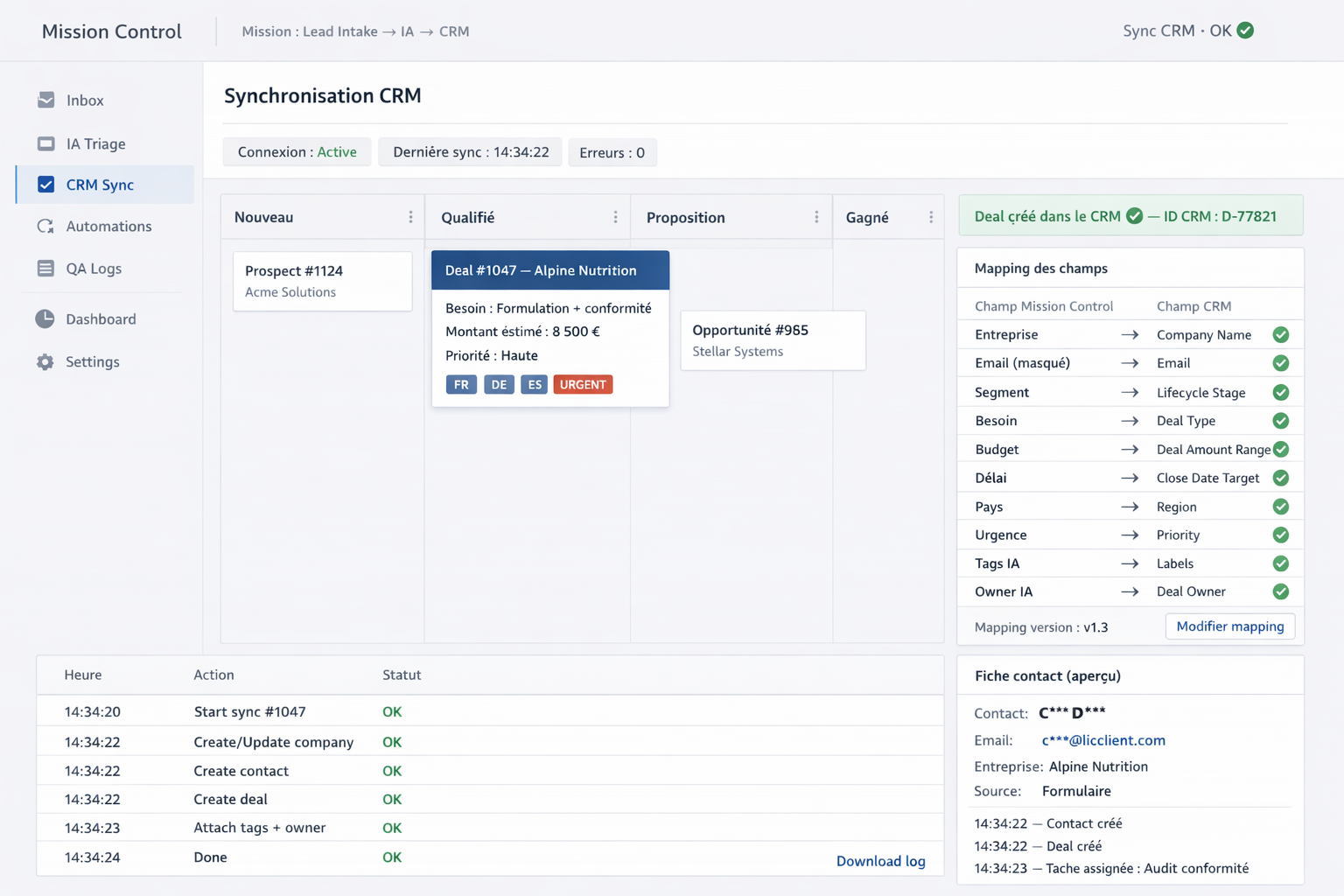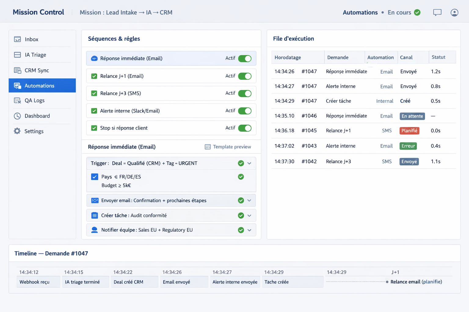Automatisation IA (Make/n8n), CRM, tracking (GA4/GTM), SEO/Ads. Mise en place de workflows Lead→Qualification→CRM→Relances, dashboards + tests + documentation. -