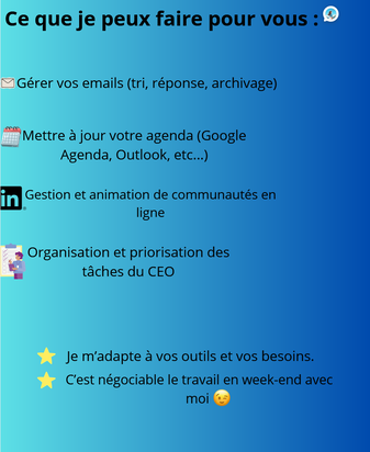 Bonjour, je suis assistante virtuelle spécialisée en gestion administrative et support client en français. Je maîtrise la gestion d’e-mails, la saisie et le traitement de données, ainsi que la rédaction simple et claire. Je vous aide à gagner du temps en prenant en charge vos tâches répétitives avec rigueur et efficacité. Disponible 20 heures par semaine, je réponds rapidement et travaille toujours avec sérieux et confidentialité. N’hésitez pas à me contacter pour toute demande ou projet, je suis là pour vous accompagner.