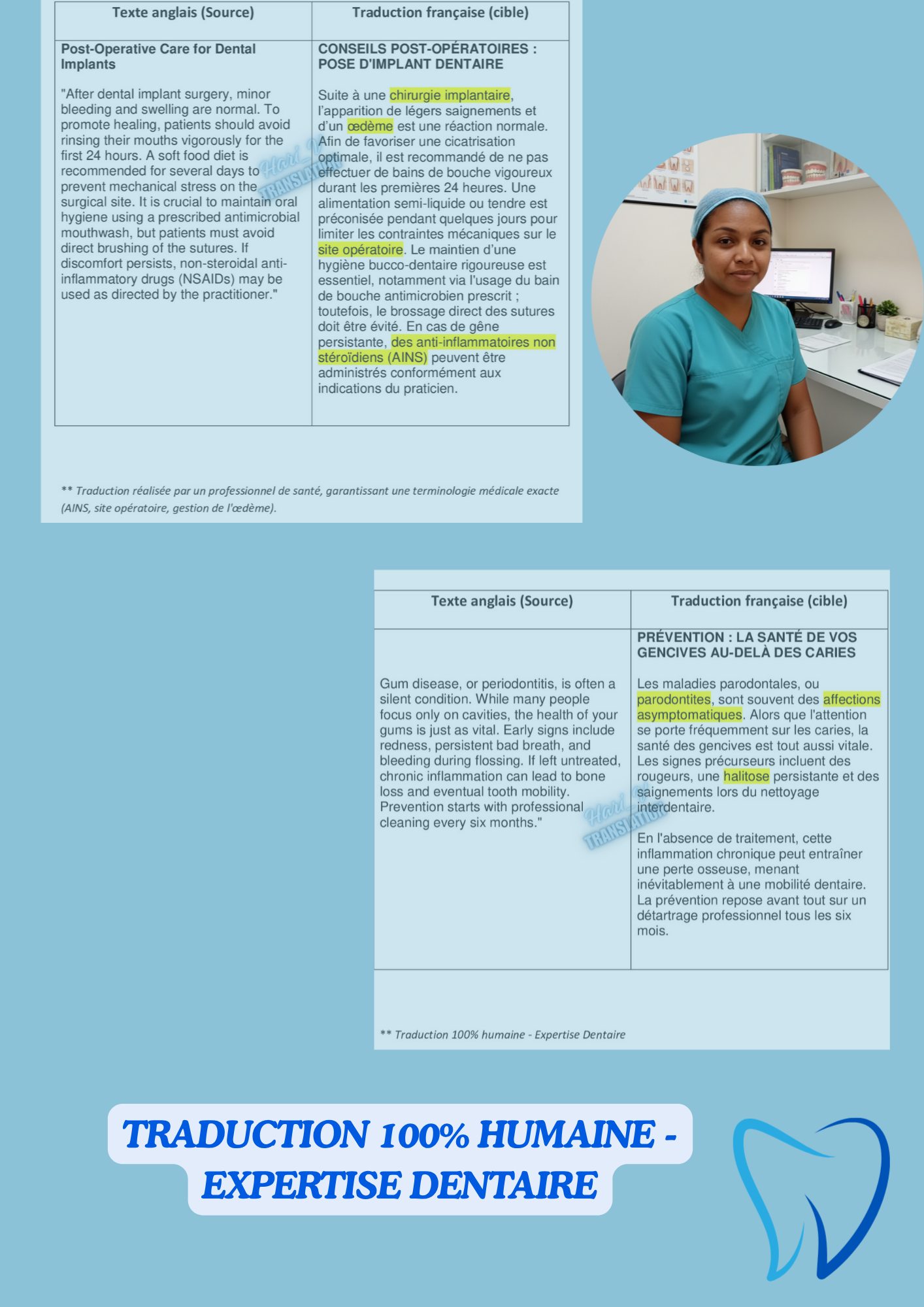 - Maîtrise du jargon technique: En tant que praticienne, je maîtrise parfaitement les subtilités de l'odontologie (implantologie, parodontie, endodontie) et de la médecine générale. Je comprends le fond de vos documents, pas seulement la forme.