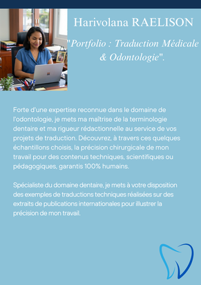 Je suis chirurgien-dentiste de profession et passionnée par la communication scientifique. Aujourd'hui, je mets ma double expertise au service de vos projets de traduction médicale et odontologique (Anglais > Français).