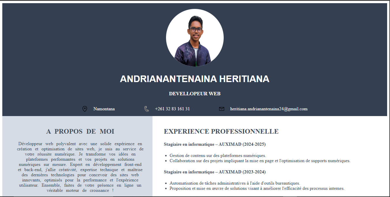 Je suis Heritiana, développeur web et rédacteur SEO, avec une double expertise en conception de sites modernes et en création de contenus optimisés pour le référencement. à travers mes services, je mets en avant trois piliers fondamentaux : qualité, créativité et satisfaction client.