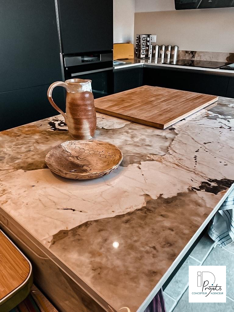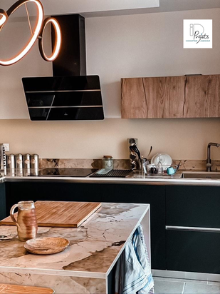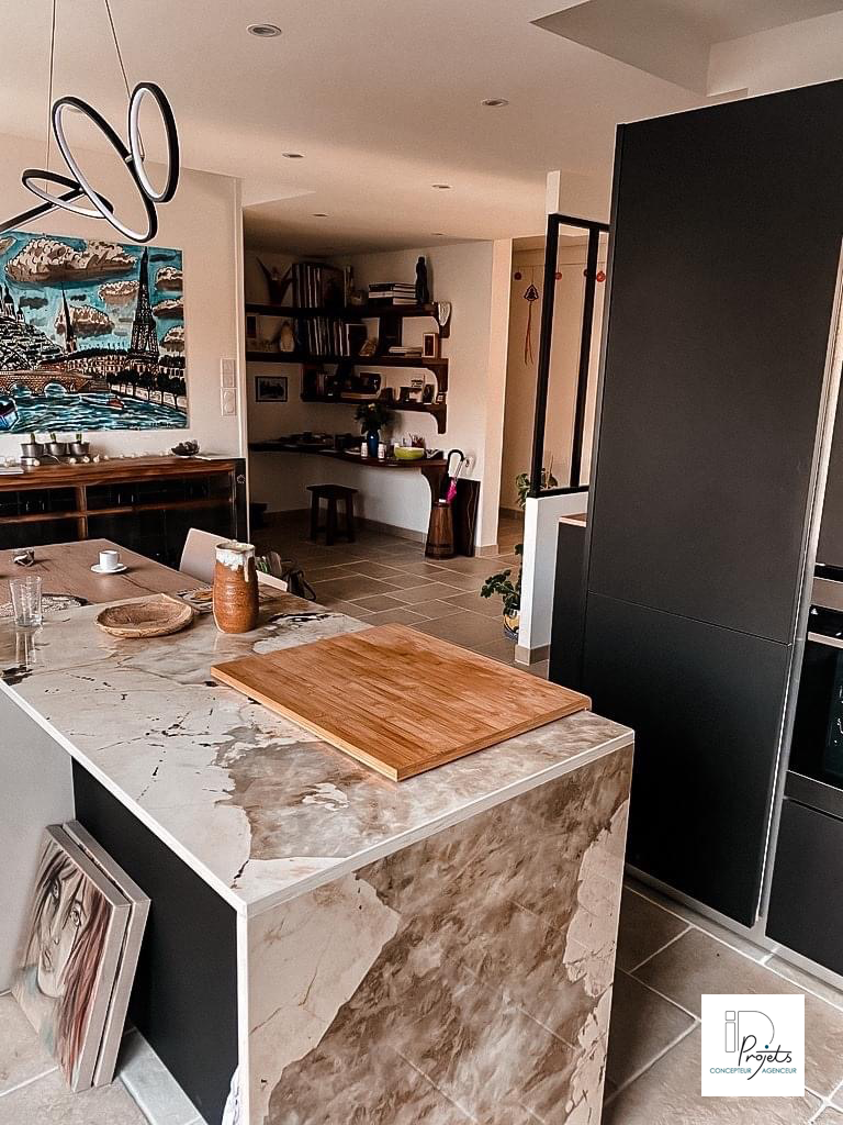 Ce projet se situe dans une maison des années 70 où les espaces de vie sont à l’étage. L’idée était de déplacer la cuisineactuelle pour libérer l’espace et créer un salon plus aéré et lumineux. La cuisine a donc été installée dans l’ancien salon, juste à côté de la terrasse, offrant fluidité et convivialité entre les espaces.